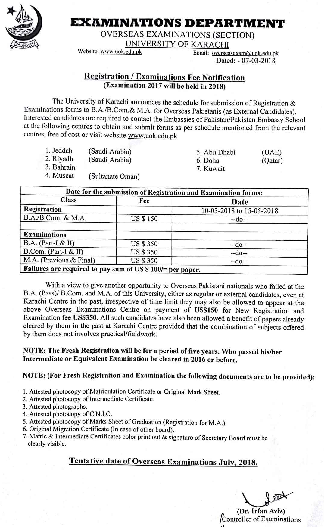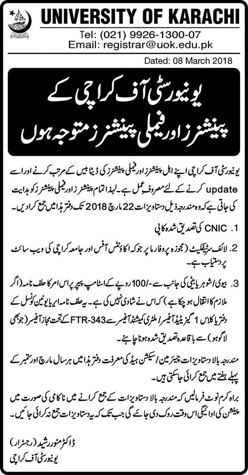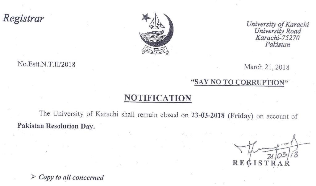 A program entitled " Nojawano ka Pakistan" on the eve of Pakistan Day organized by University of Karachi will be held on Friday, 23rd March at 10:00 am at Arts Auditorium, University of Karachi. Meanwhile, Registrar notified that University of Karachi will remain closed on the said date on account of Pakistan Day.