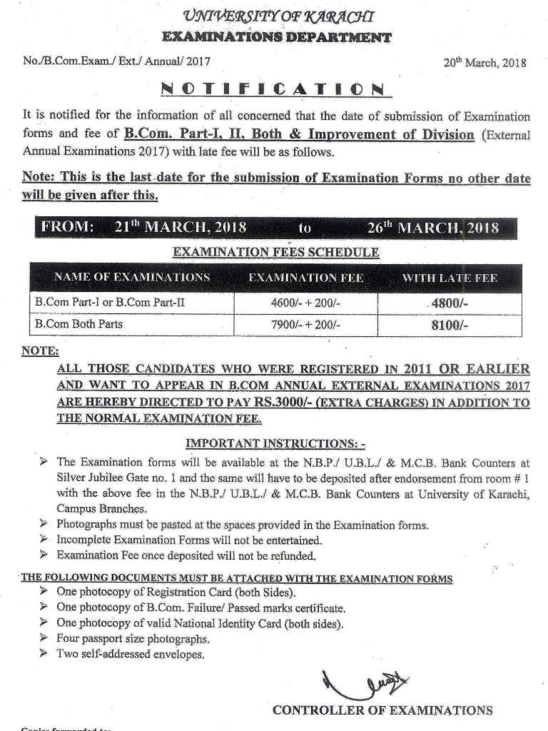 B.Com Part I, II, Both & Improvement of Division External Annual Examination 2017