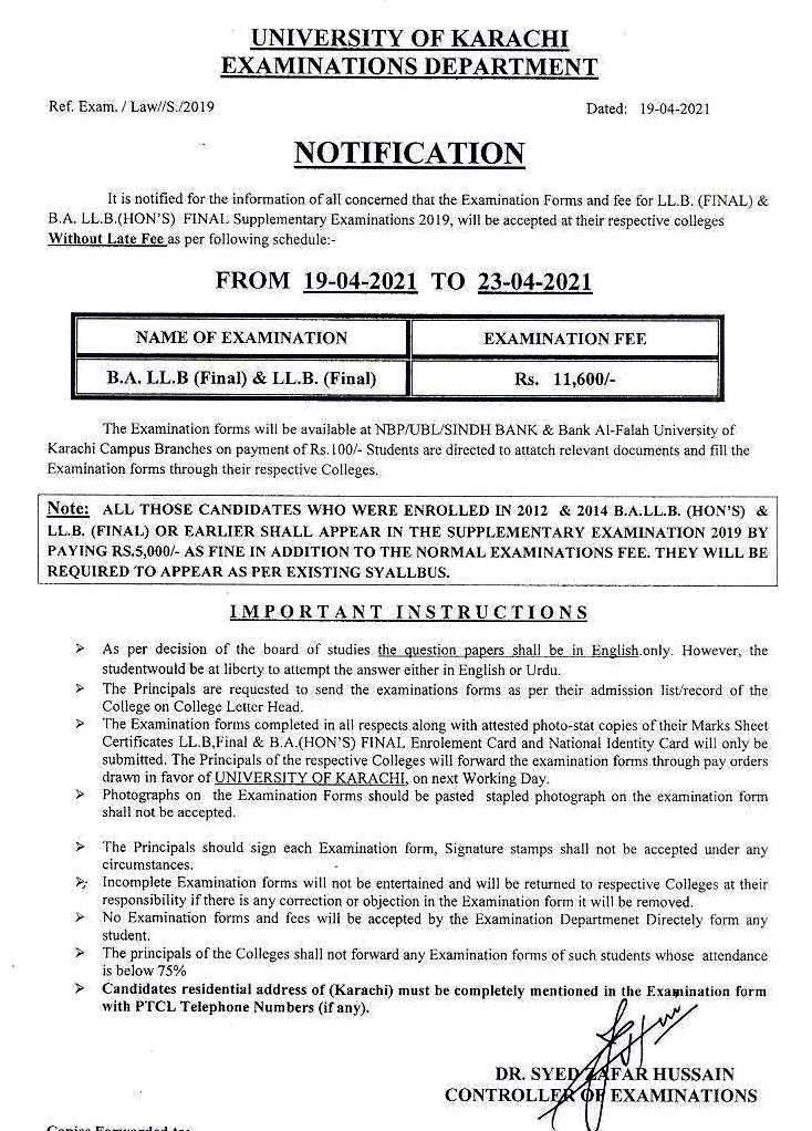 Fee Schedule for LL.B / BA. LL.B (Final) Supplementary Examination 2019