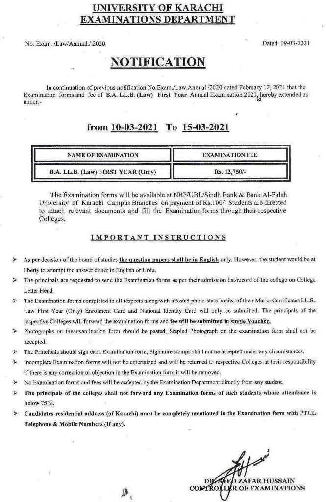 B.A. LLB First Year Examinations Fee Schedule