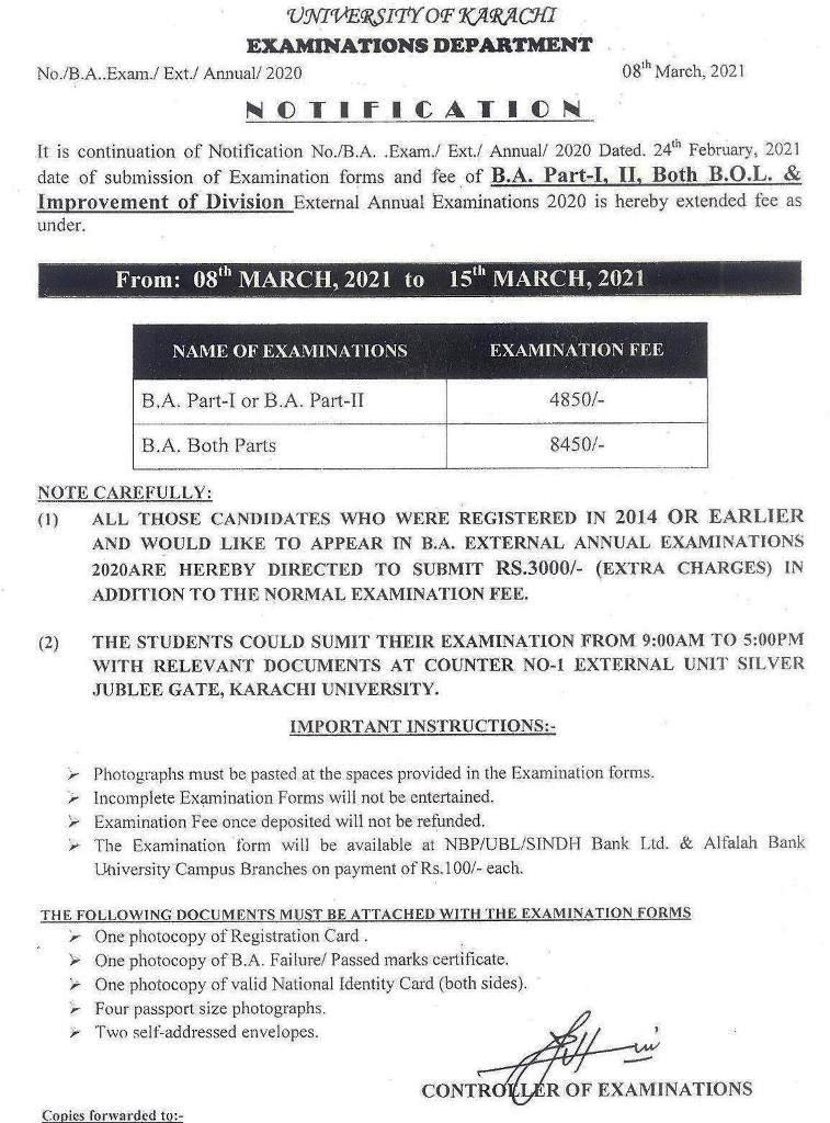 Submission of B.A (Ext) Examination Forms and Fee