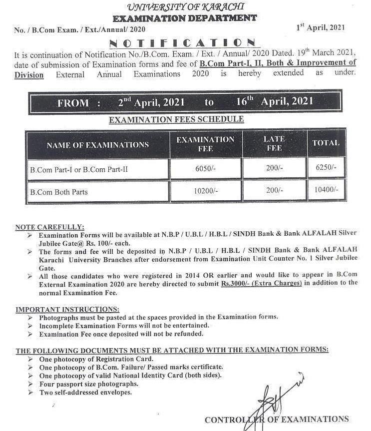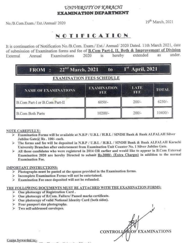 B.Com (Ext) Examination Fee Schedule 2020