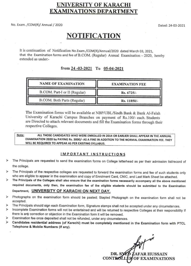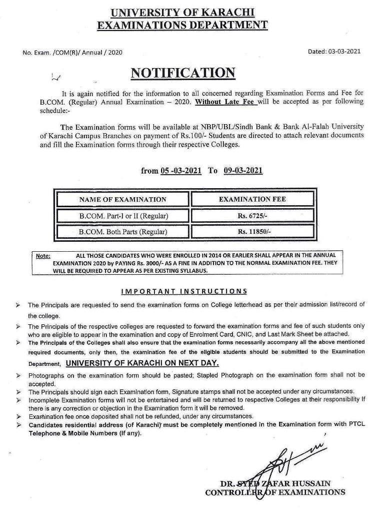 Fee Schedule of B.Com Annual Examination 2020