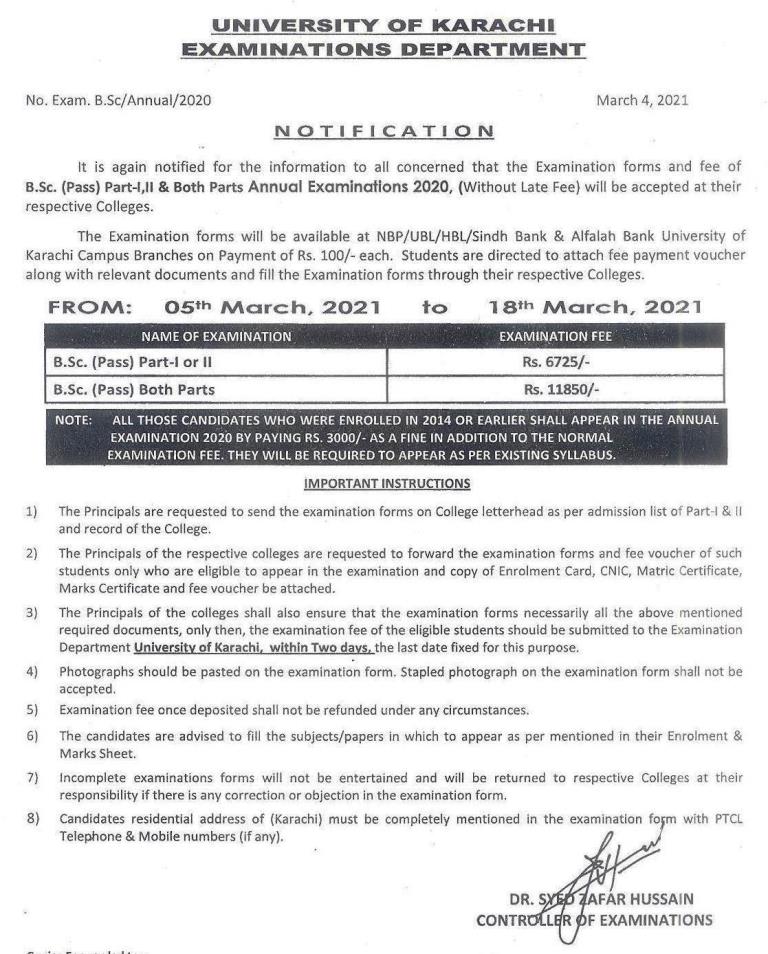 B.Sc (Pass) Annual Examination Fee Schedule 2020