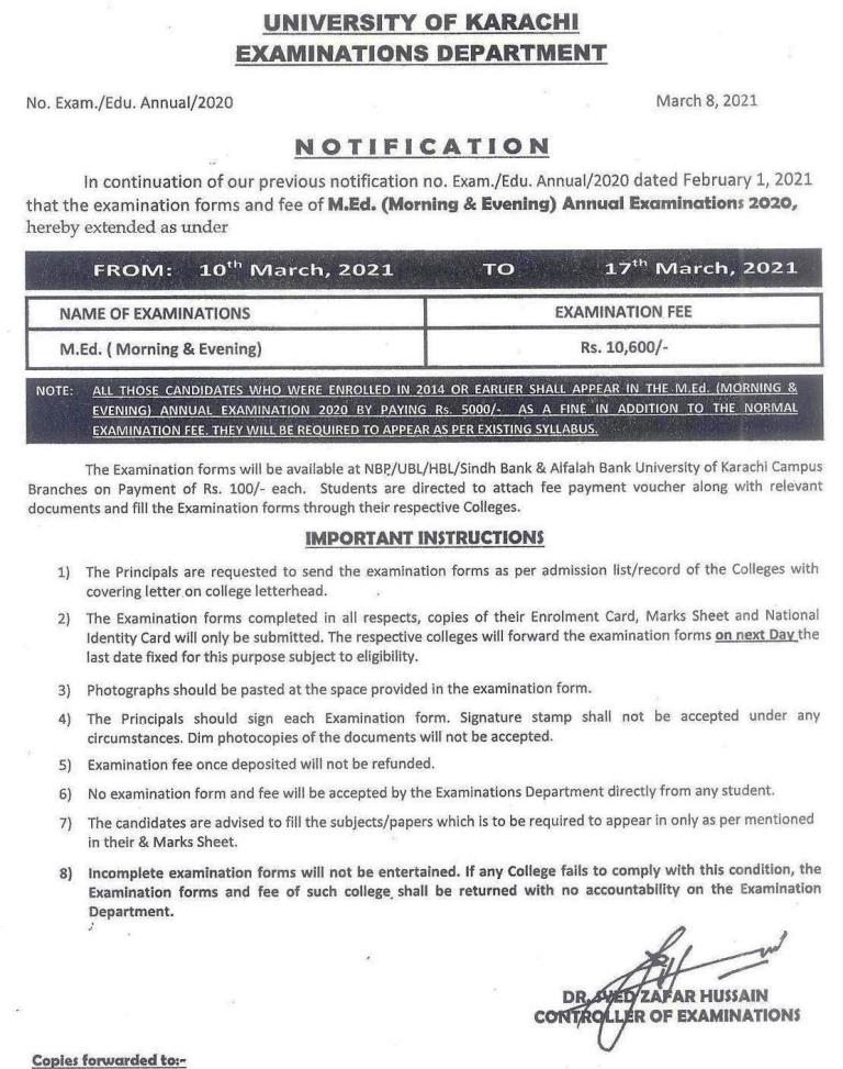 M.Ed (Morning & Evening) Examinations Fee Schedule