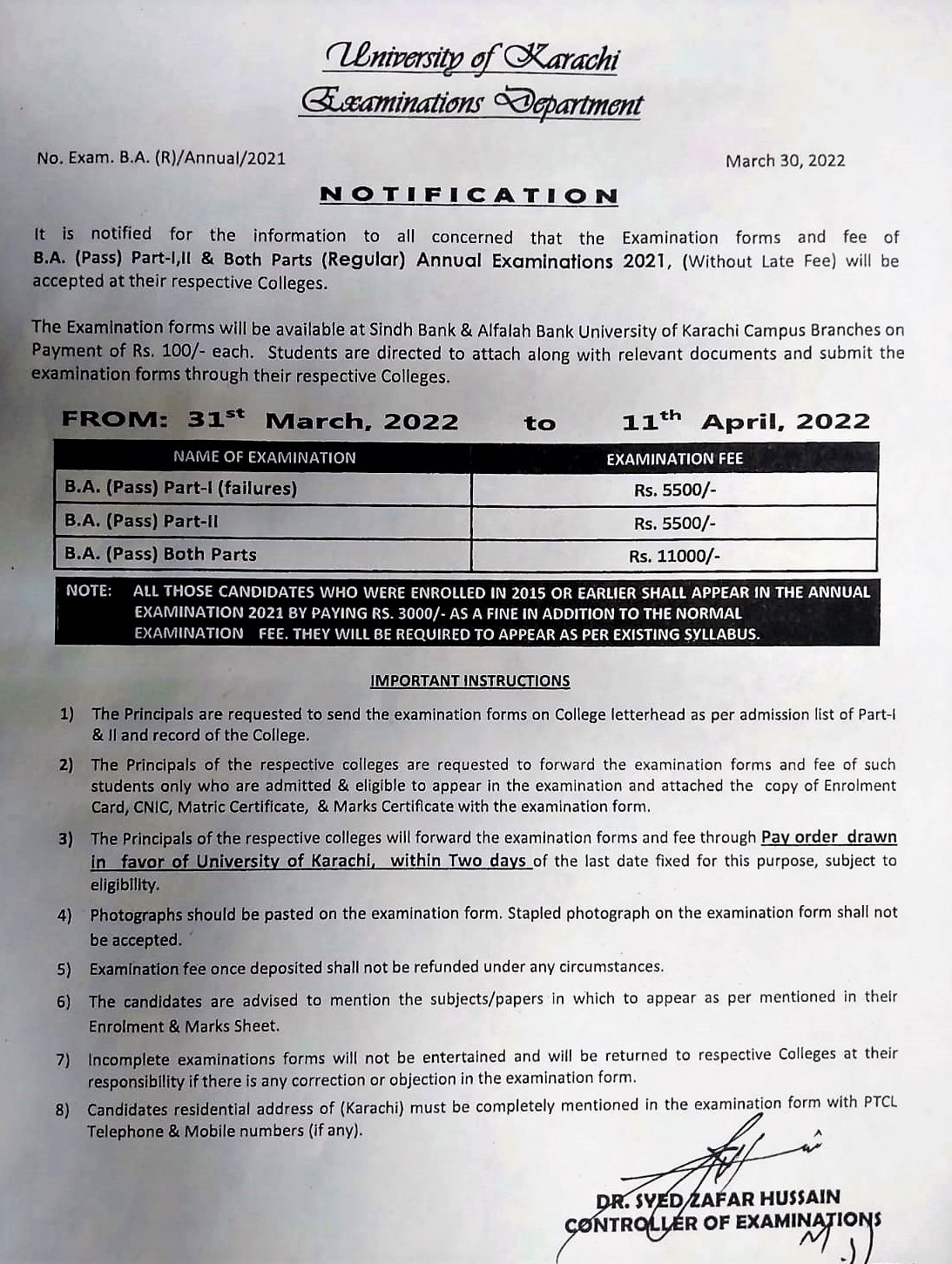 Submission of B.A (Reg) Annual Examinations Form 2021