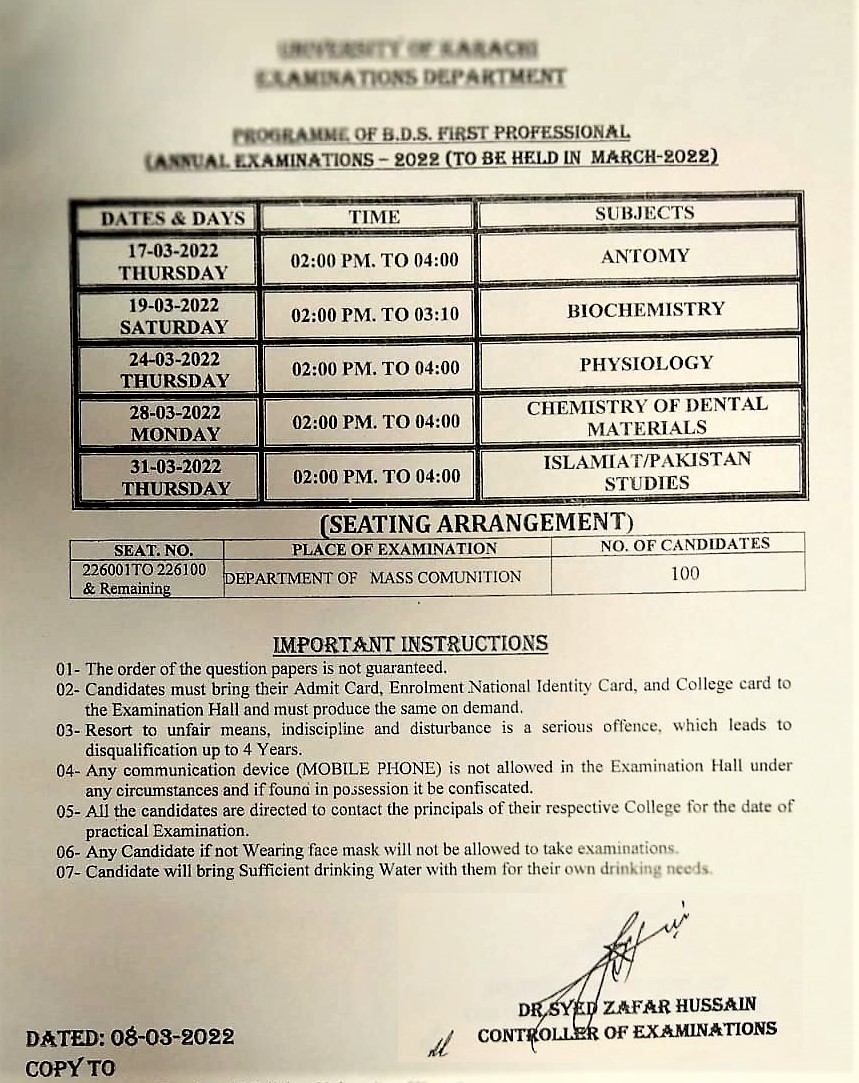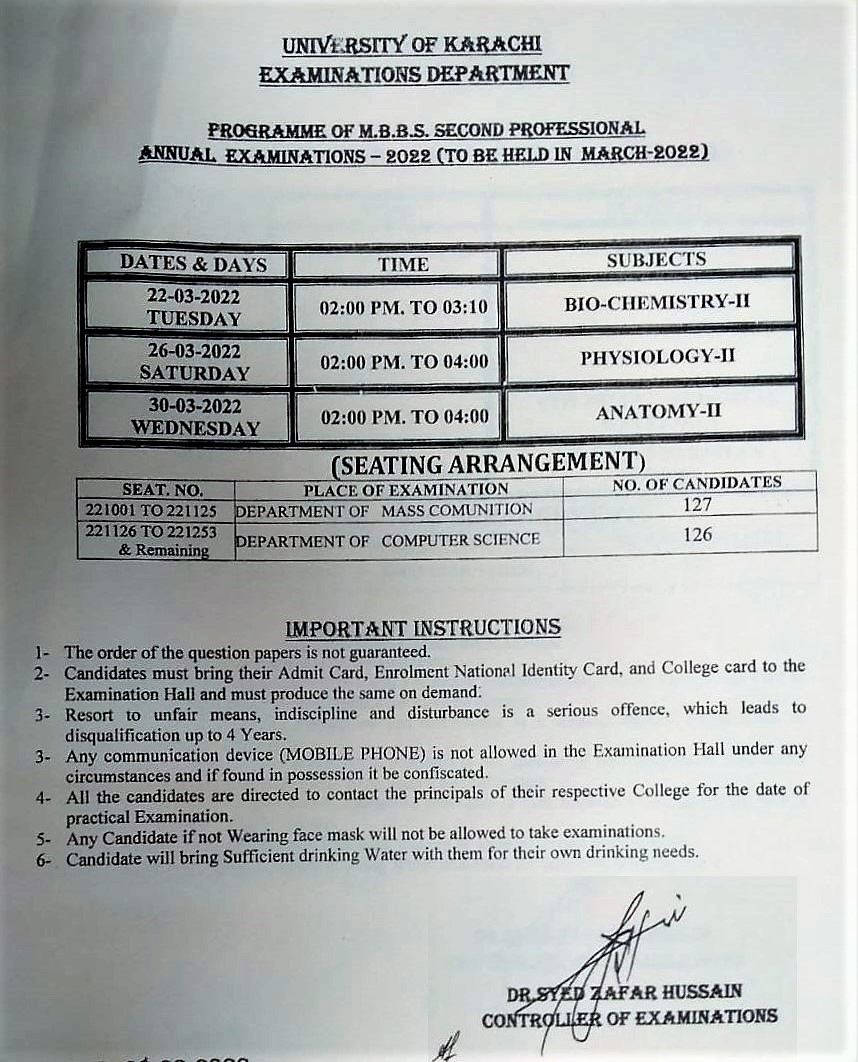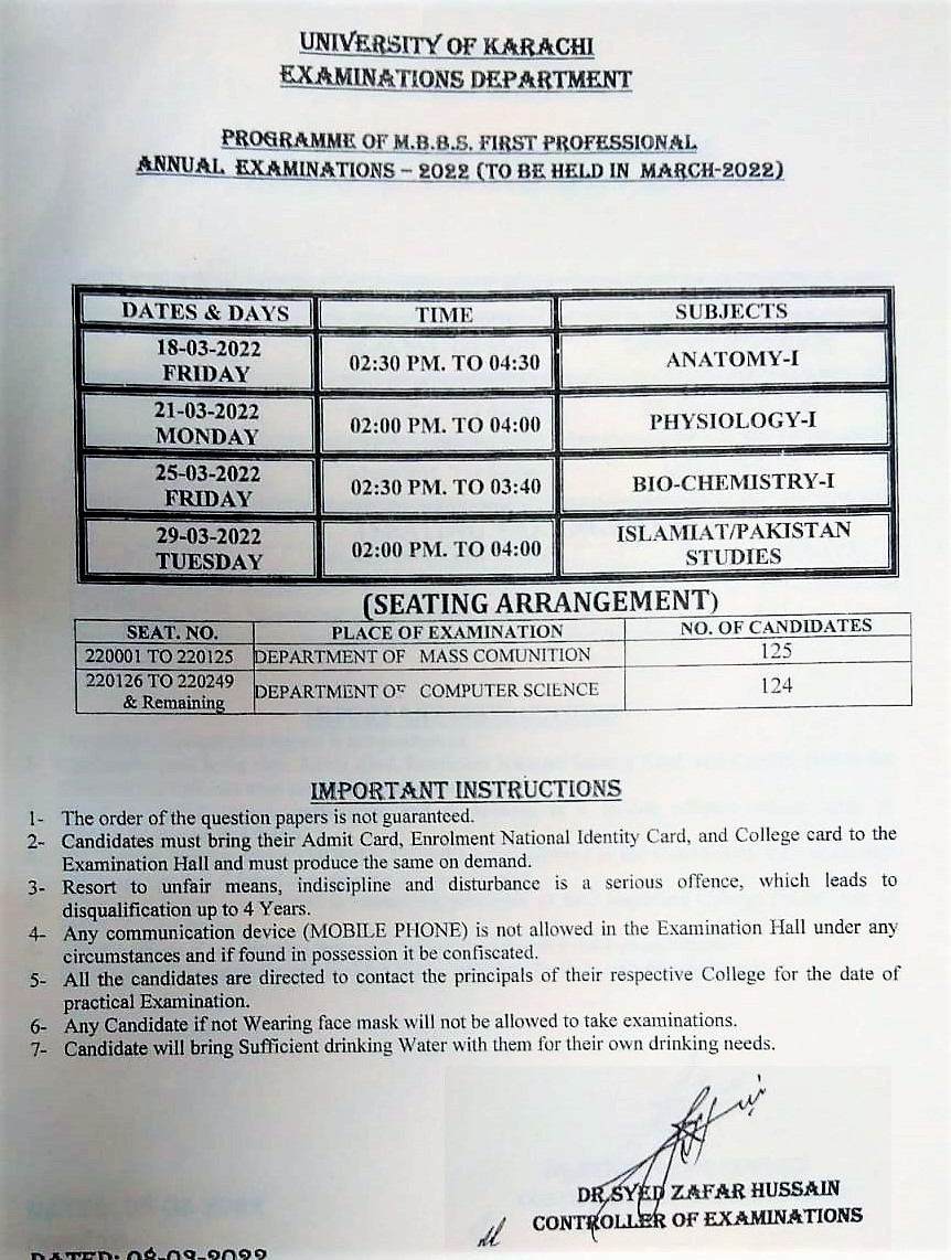 Date Sheet of M.B.B.S Annual Examinations 2022