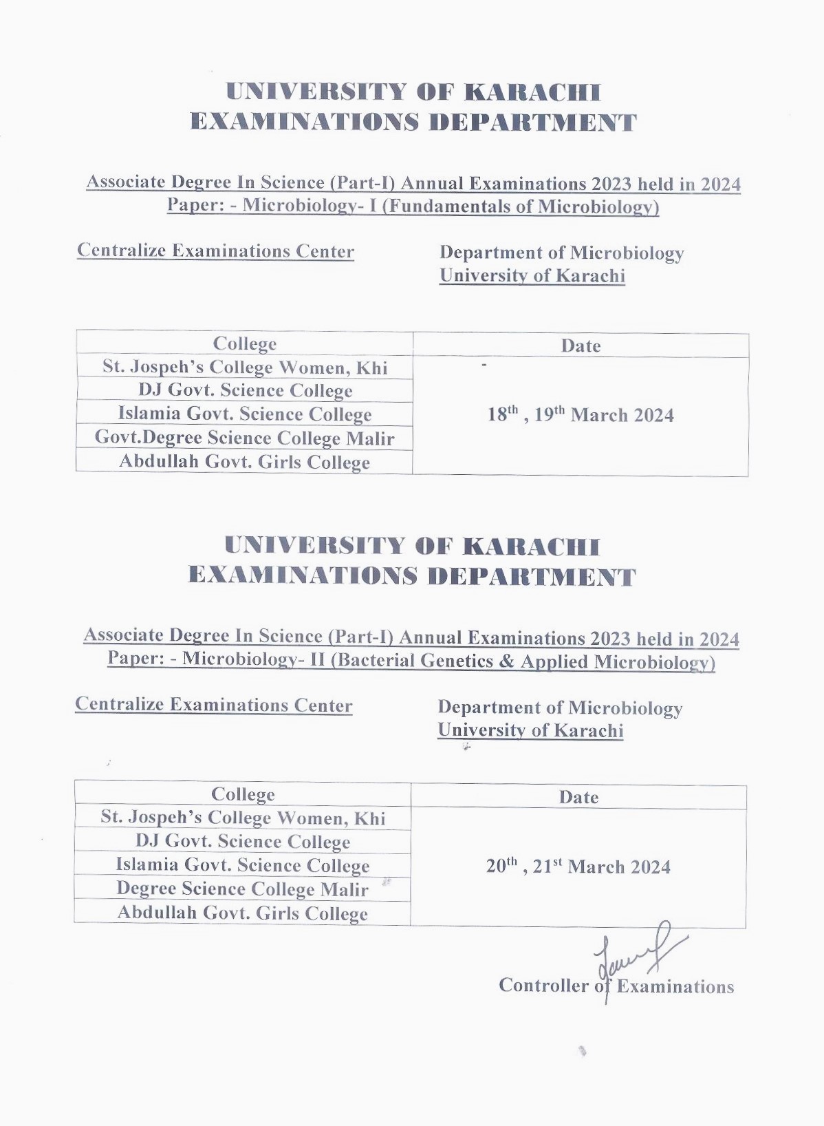 A.D.S Part-I Microbiology Paper I & II, Annual Examinations 2023