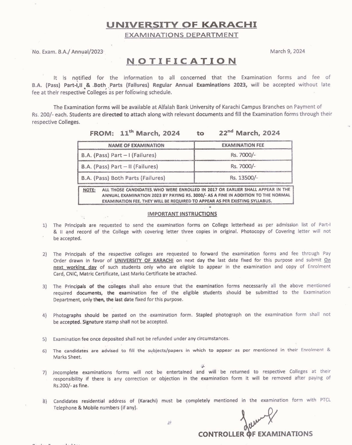 Fee Schedule for B.A (Pass) Failures Regular Annual Examination 2023