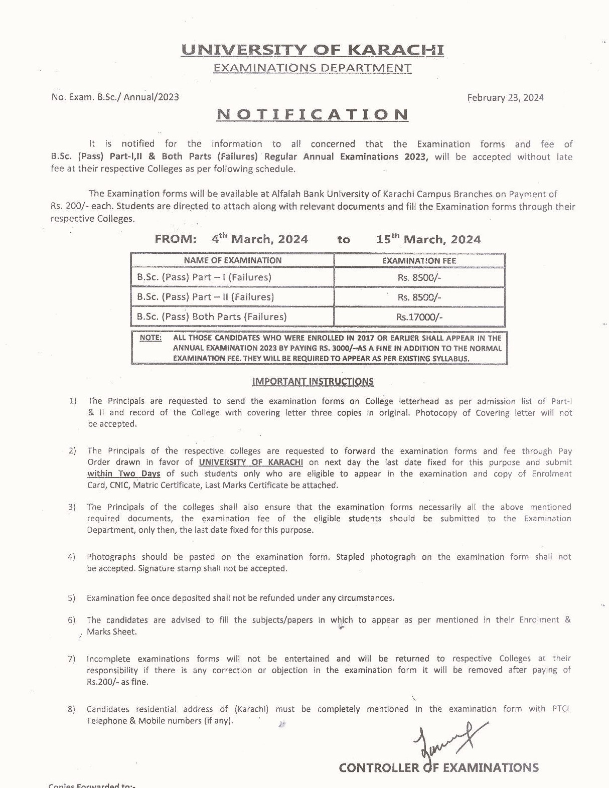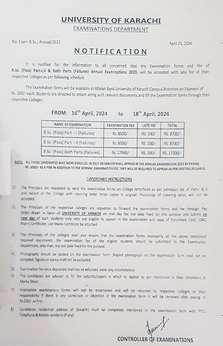 Fee Schedule for B.Sc (Pass) Failures Annual Examination 2023