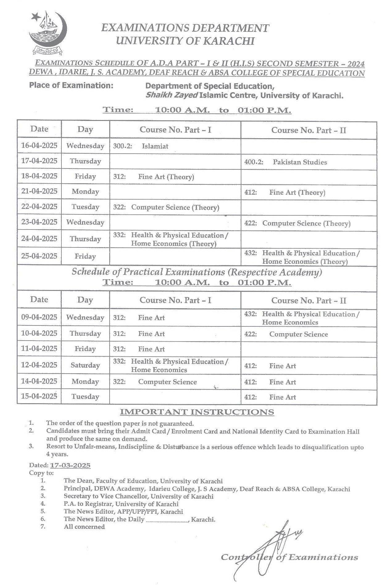 Schedule of A.D.A. (H.I.S) Second Semester Examinations 2024