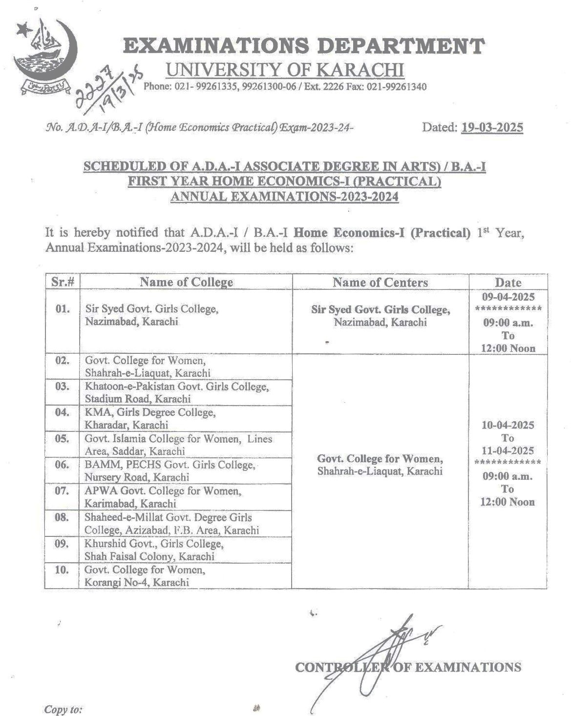 Schedule of A.D.A. (Home Economics-I) Practical Examinations 2023-24