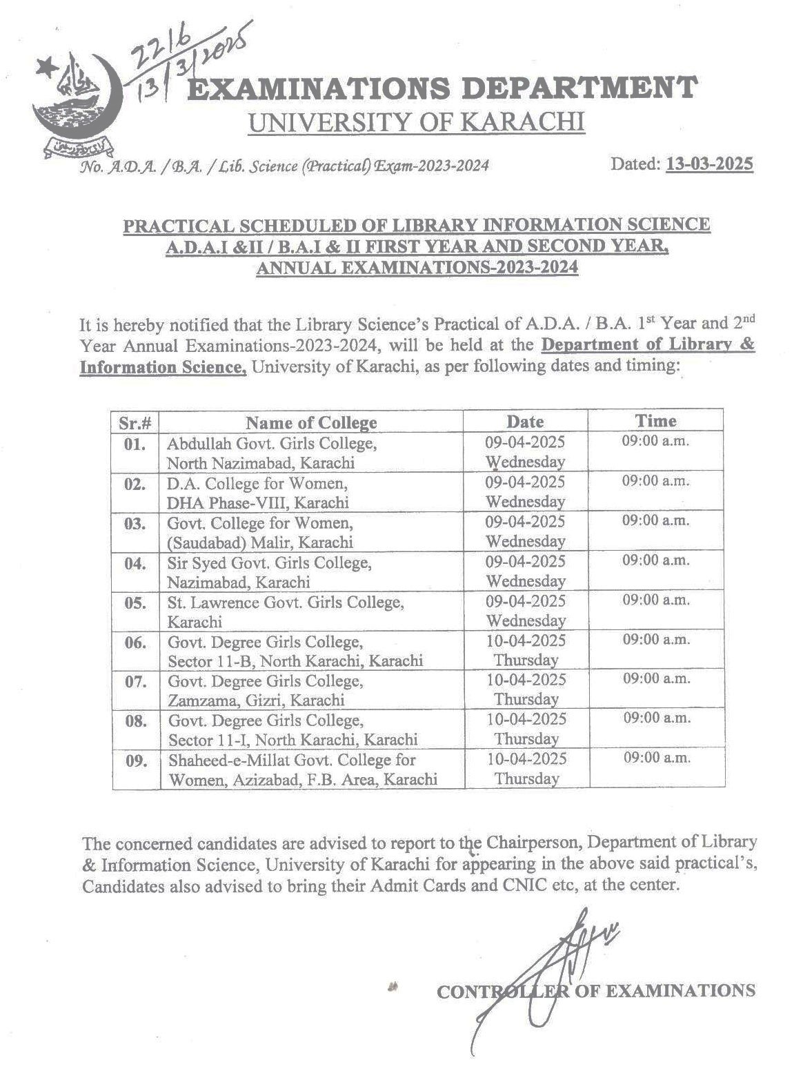 Schedule of A.D.A. / B.A. Library Infortmation Science Practical Examinations 2023-24