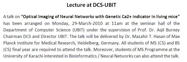 Lecture at DCS(UBIT) on "Optical Imaging of Neural Networks" on 29-March-2010 at 11 am - 28/03/10