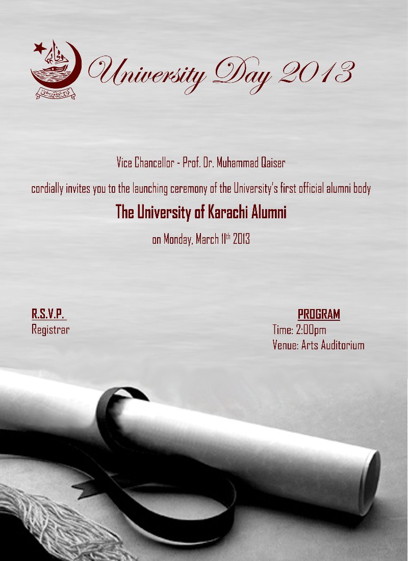 University of Karachi has launched its first official Alumni body the University of Karachi Alumni. A ceremony in this regard will be organized on 11th March 2013 at 2:00pm in the Arts Auditorium. However, the process of alumni registration has already been started. Forms are available on the University's website. For further queries email can be sent at alumni@uok.edu.pk :: Invitation Card