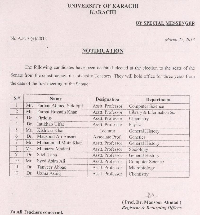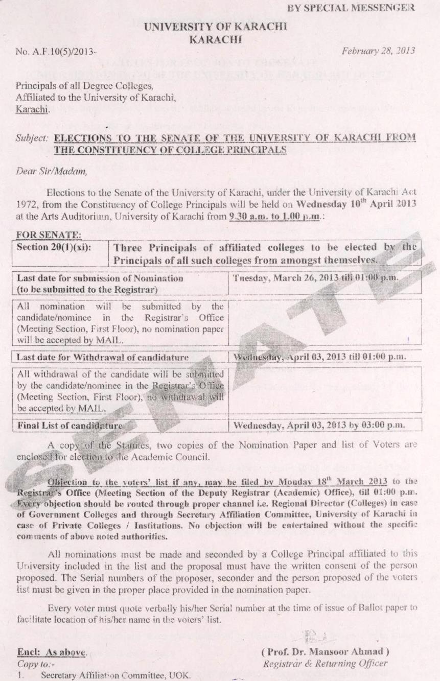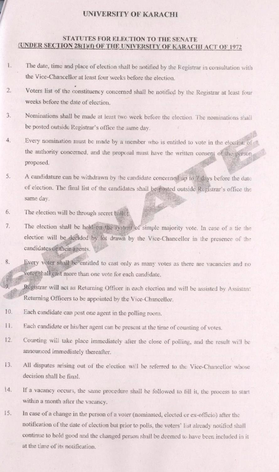 Elections of the Senate of University of Karachi :: Notice | Statutes | Voter List