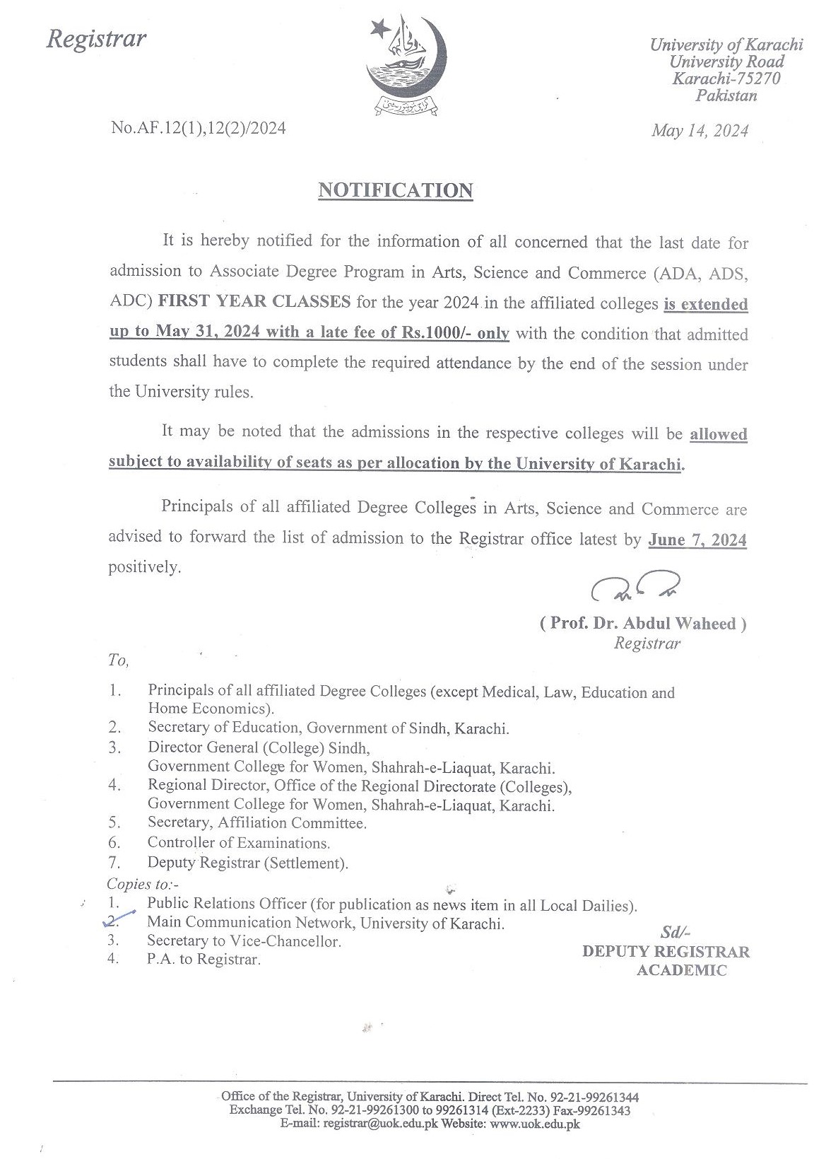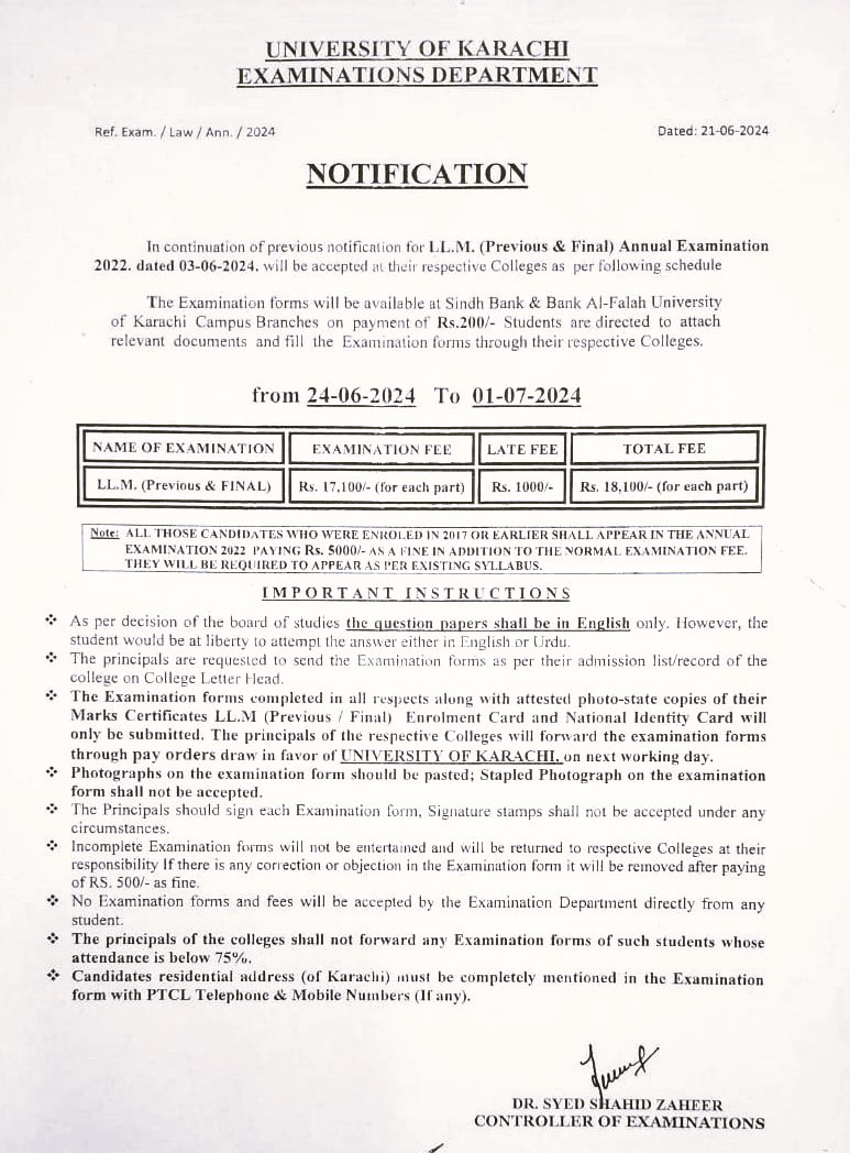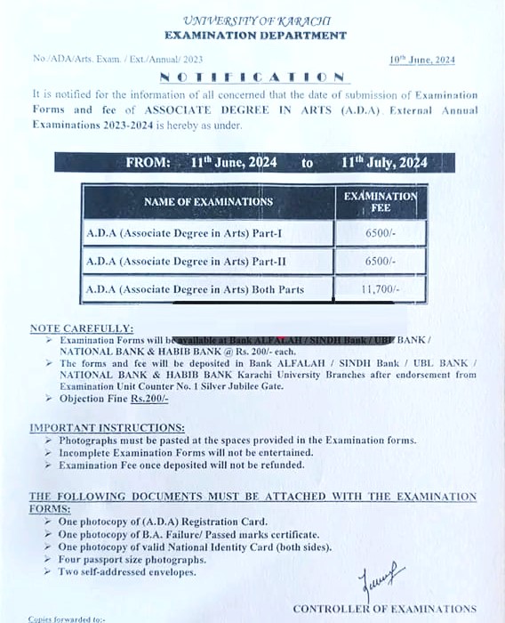 Fee Schedule for A.D.A (External) Annual Examination 2023-24