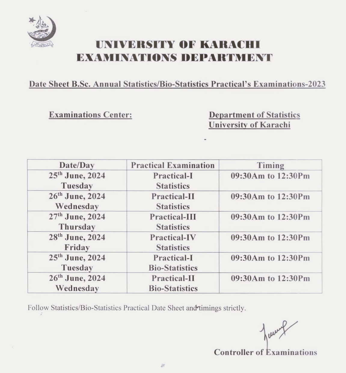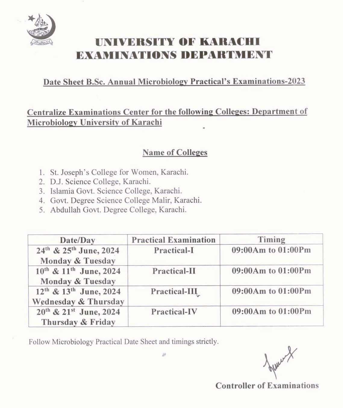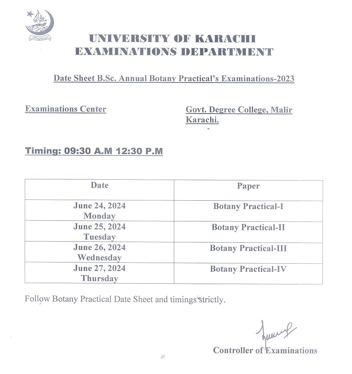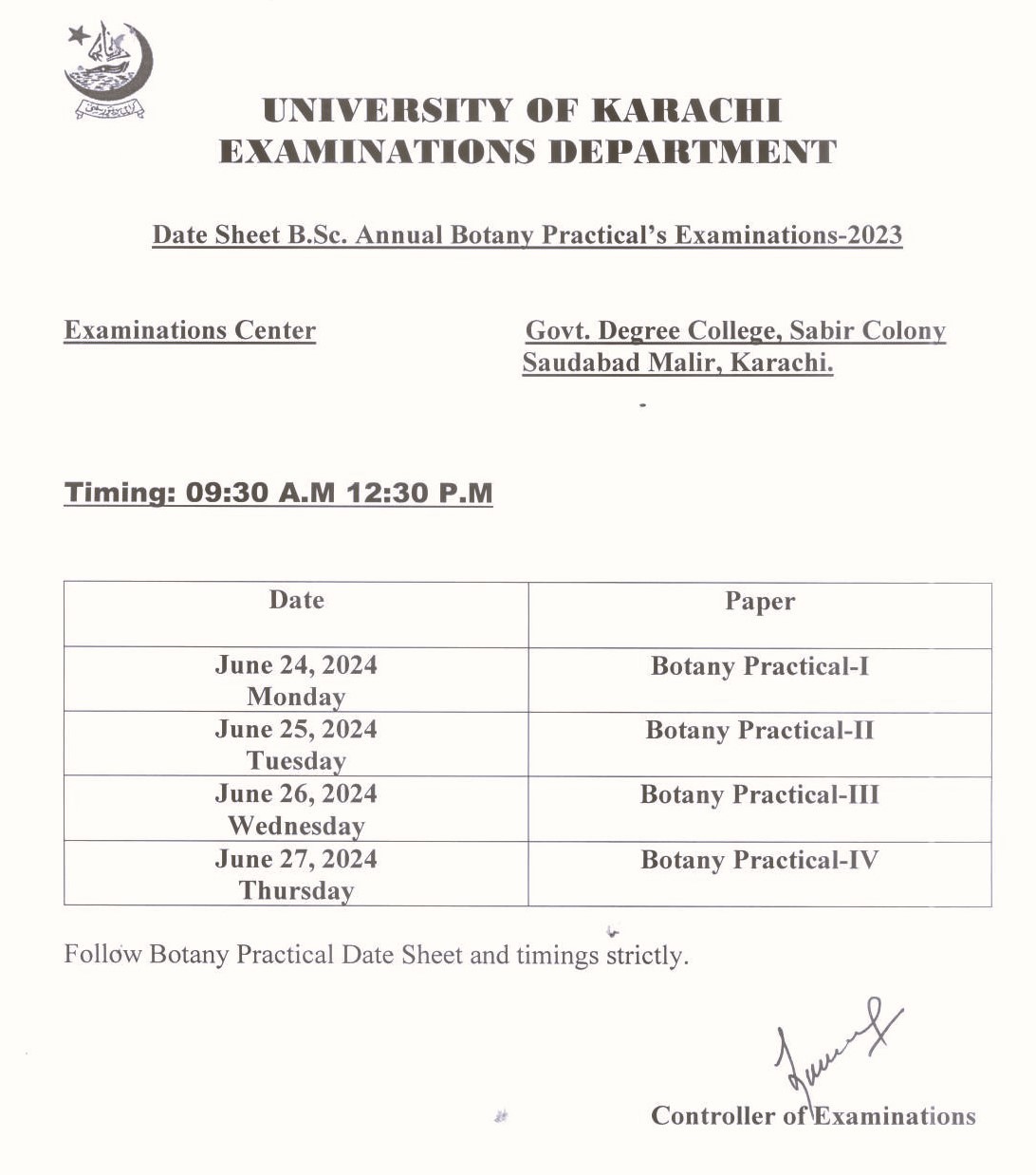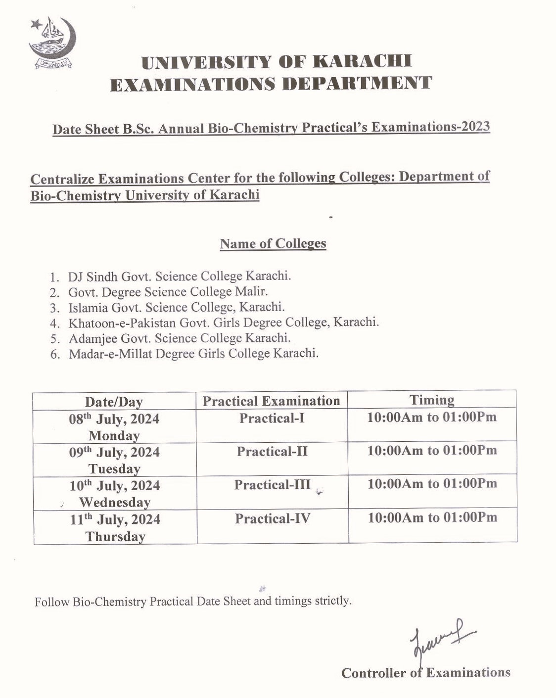 Date Sheet of B.Sc. Bio-Chemistry Annual Practical Examination 2023