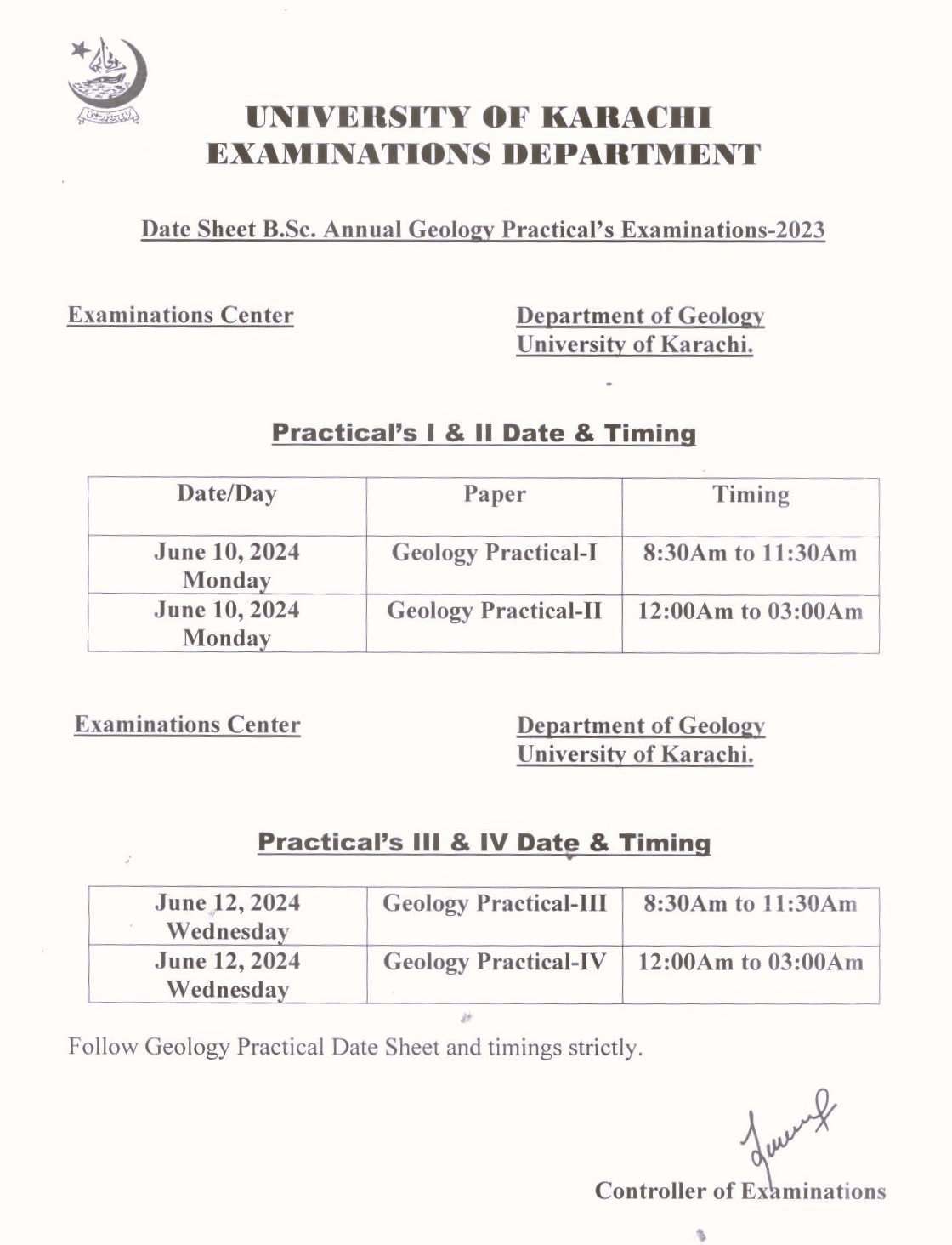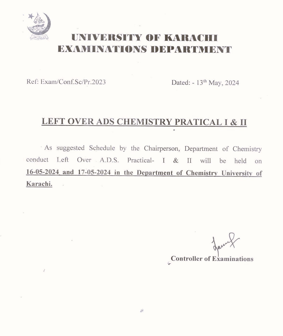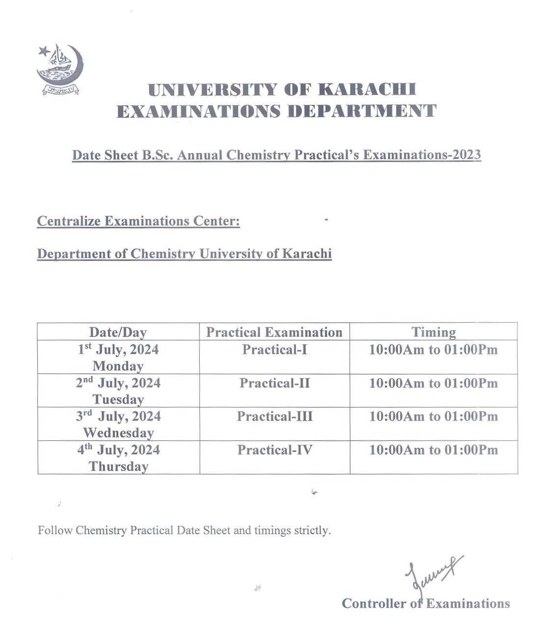 Date Sheet of B.Sc Chemistry Practicals Examination 2023