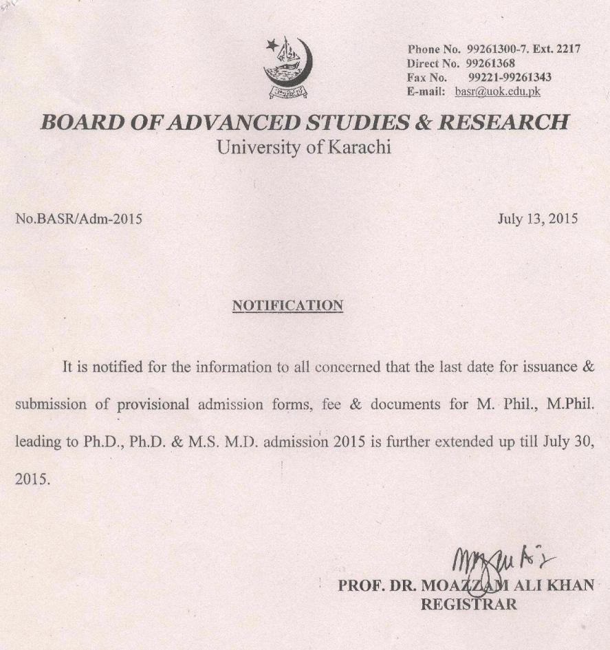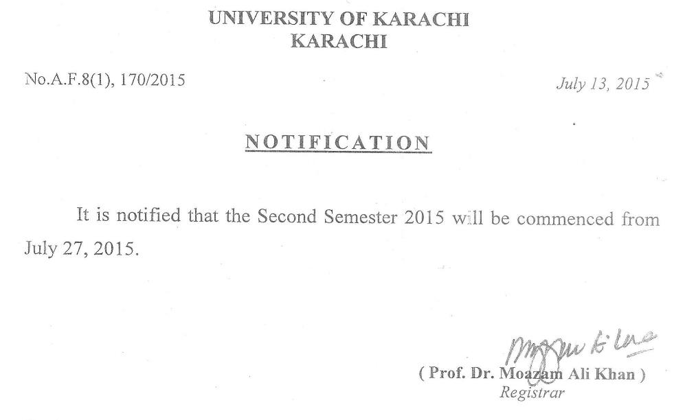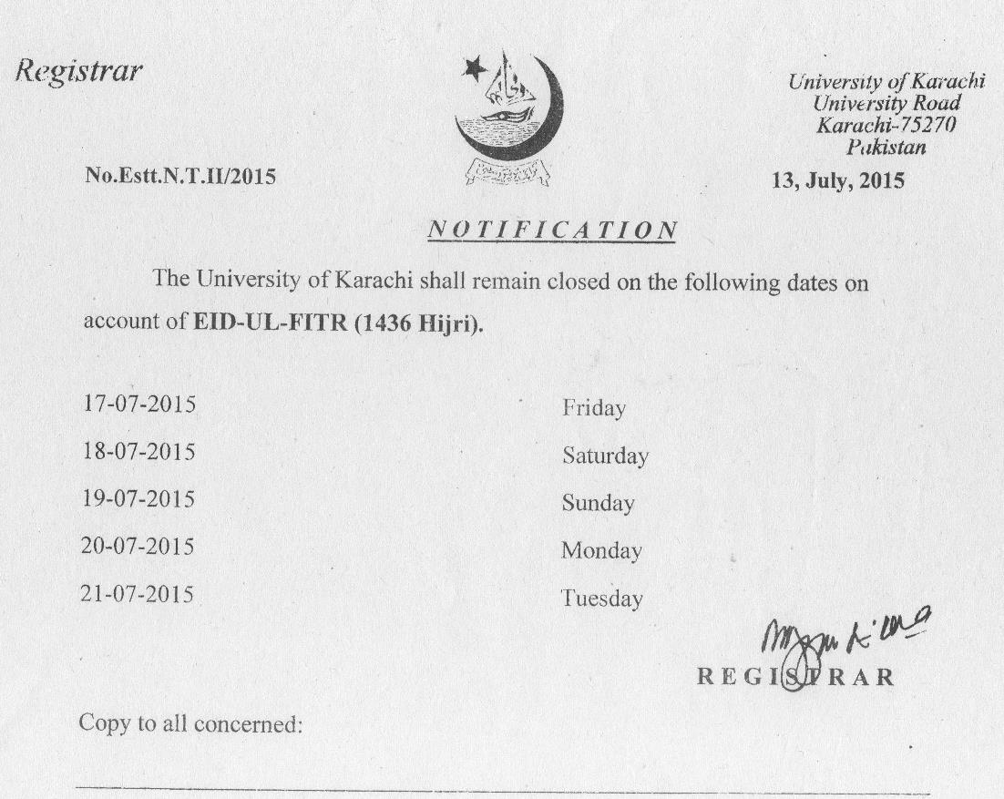 Registrar has notified that the University will remain closed on Wednesday, July 15, 2015 on account of Shab-e-Qadar.