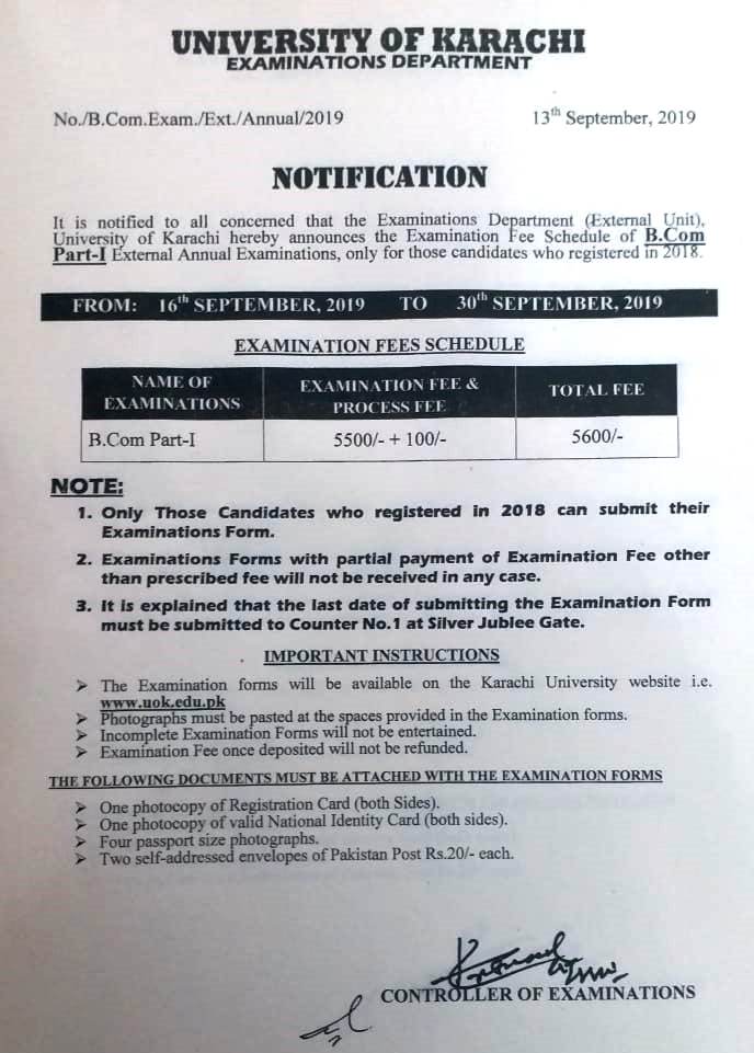 B.Com (Ext) Examination Fee Schedule