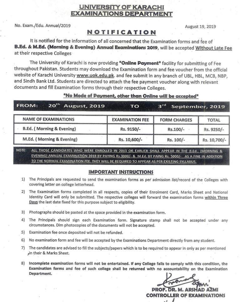 B.Ed. & M.Ed. (Morning & Evening) Annual Exam 2019
