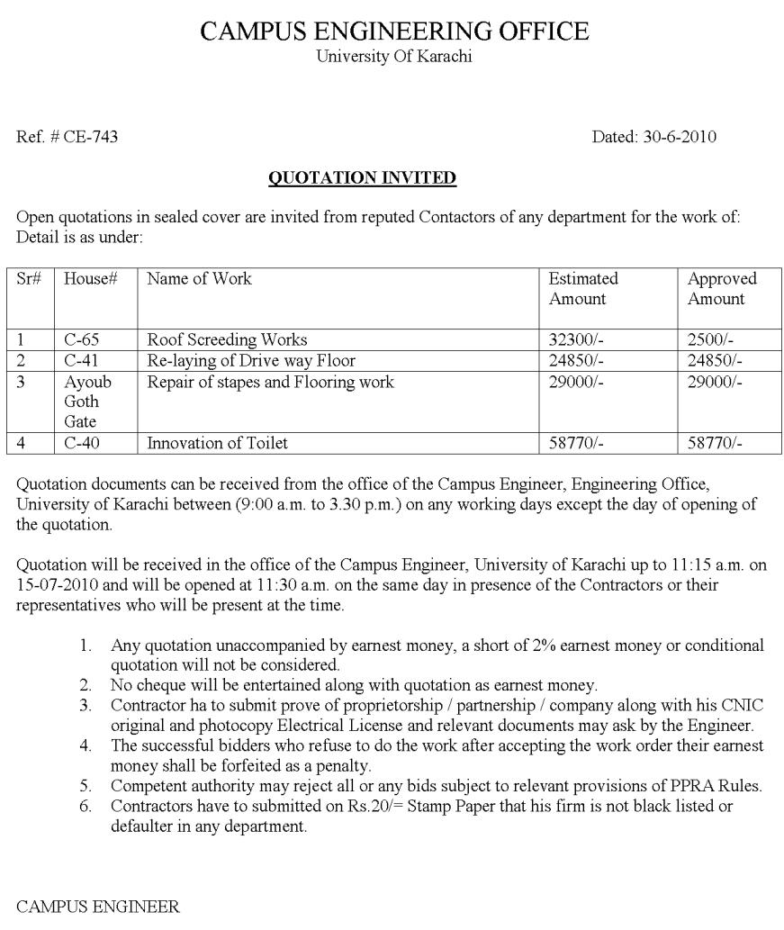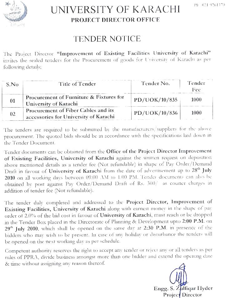 Tender invited for 'Improvement of Existing facilities at the University of Karachi' - 06/07/10