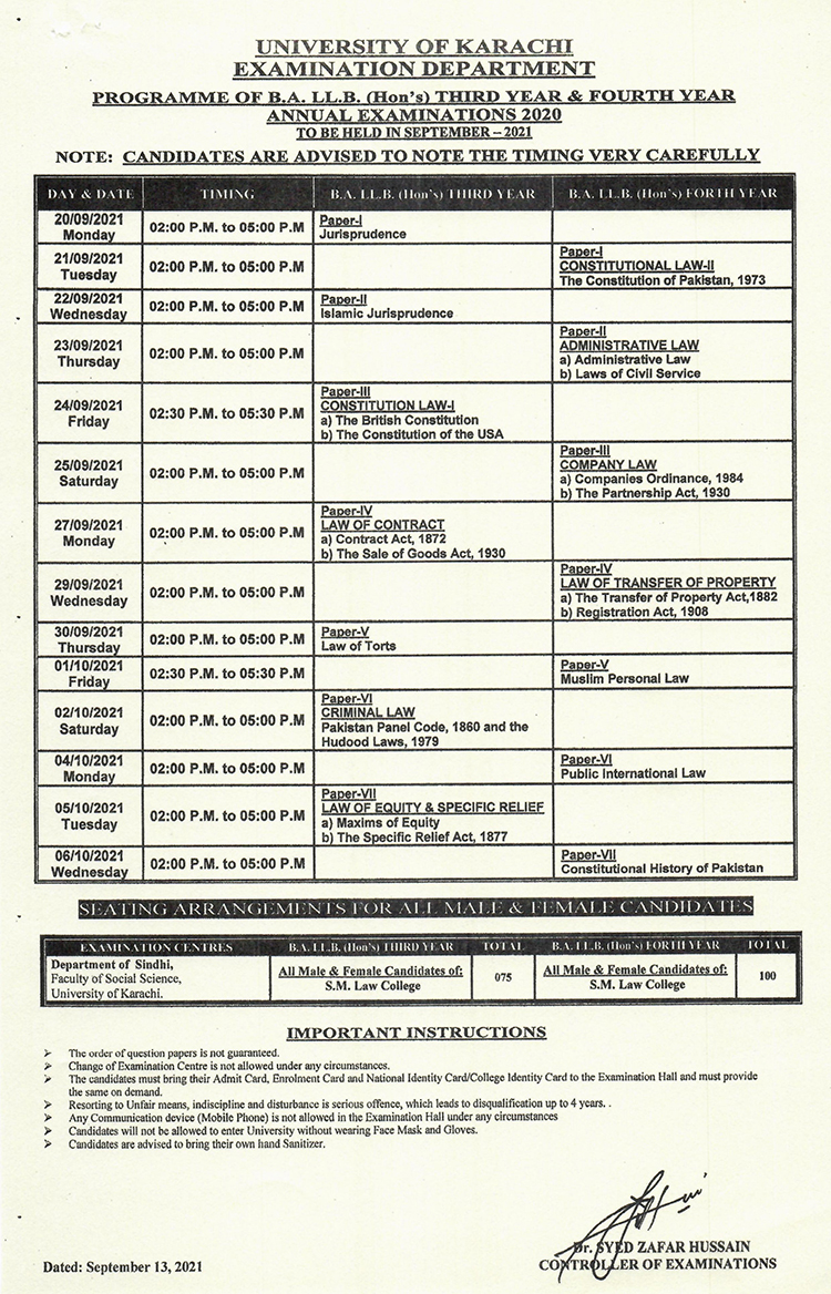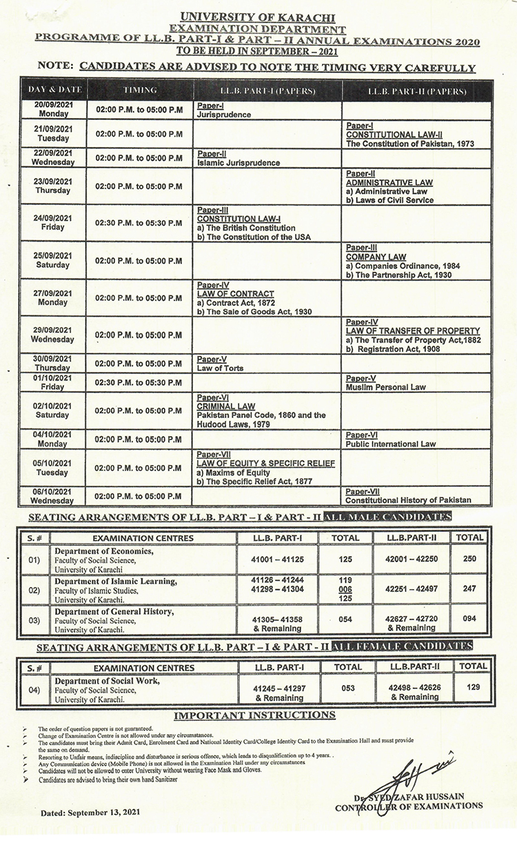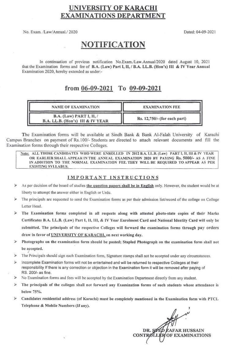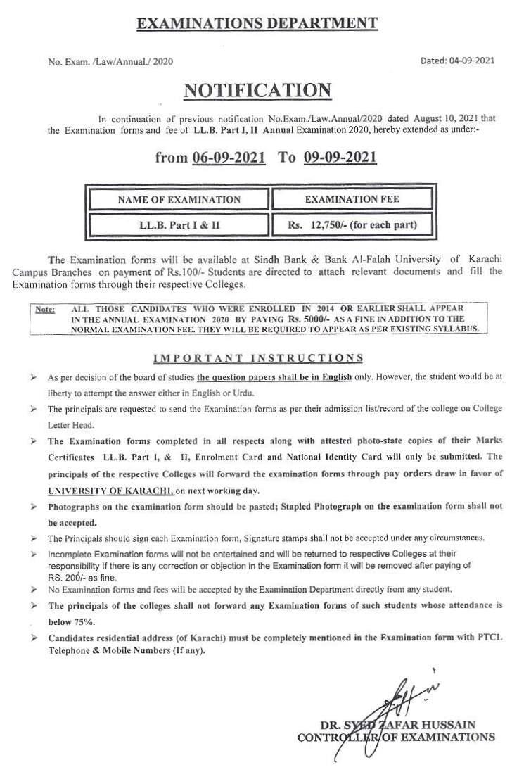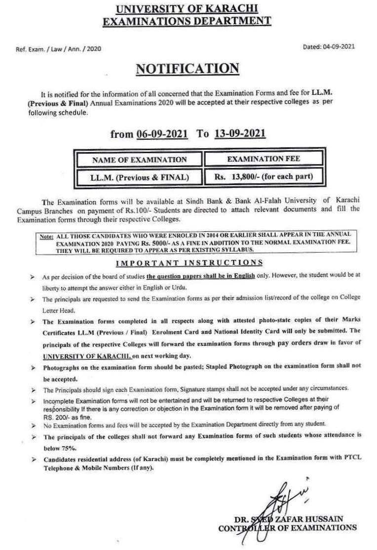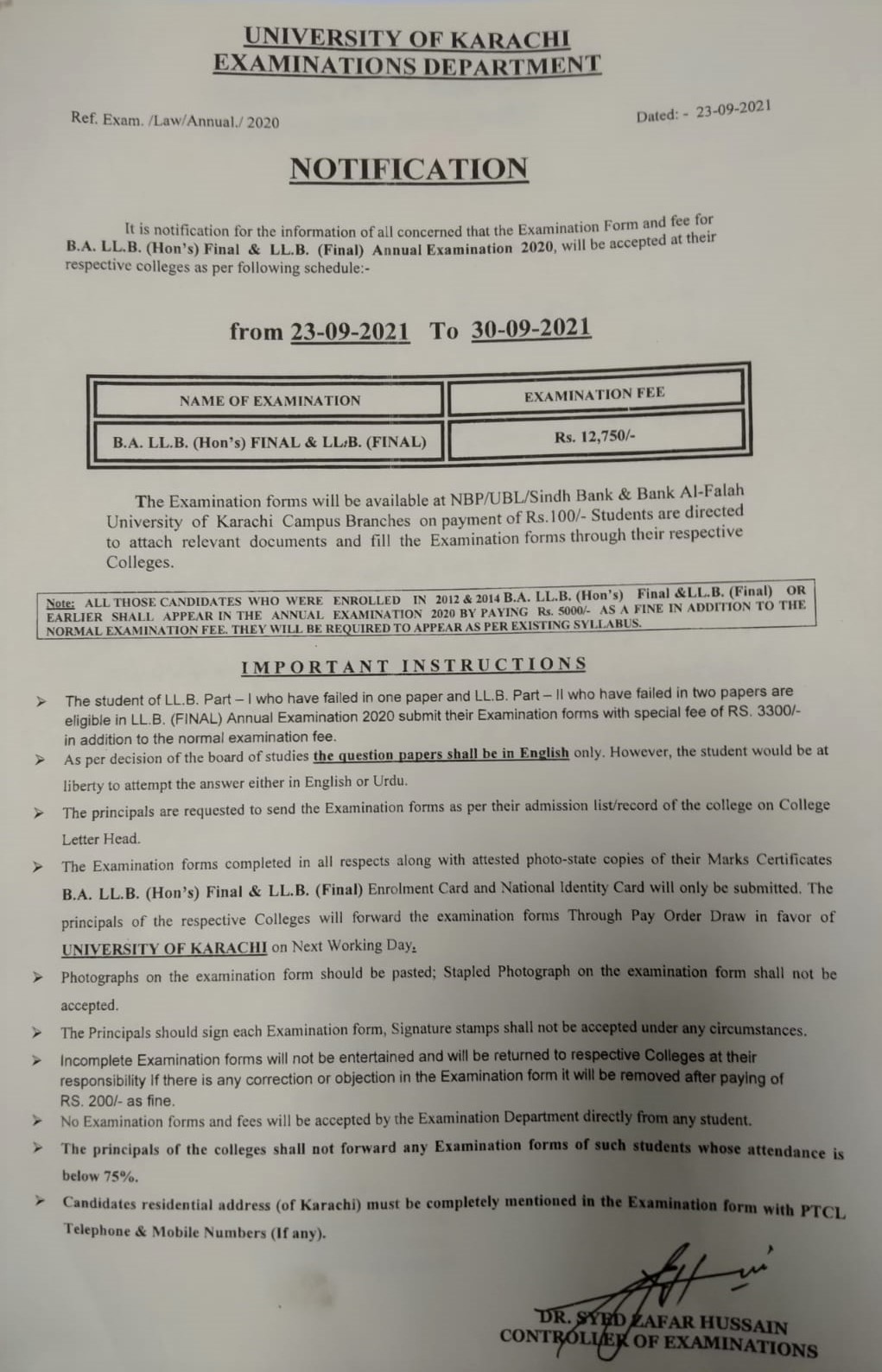 Fee Schedule B.A. LL.B (Hons) Final & LL.B (Final) Annual Examination 2020