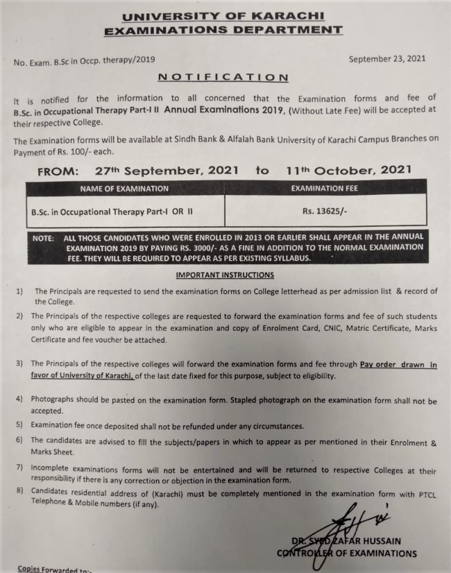 Fee Schedule of B.Sc (Occupational Therapy) Annual Examination 2019
