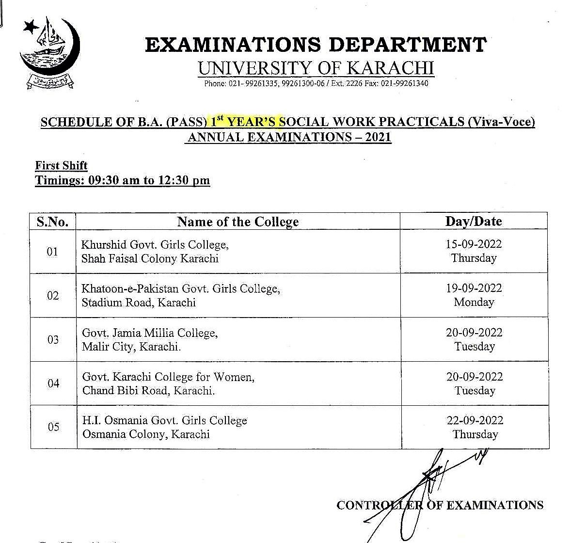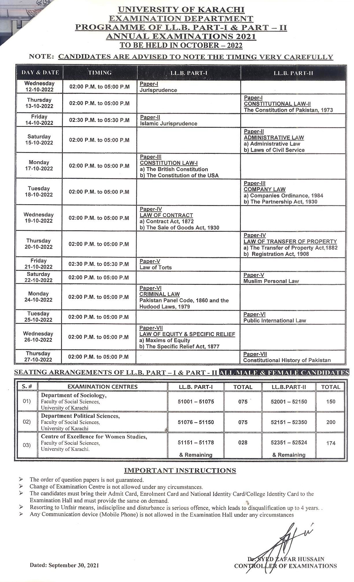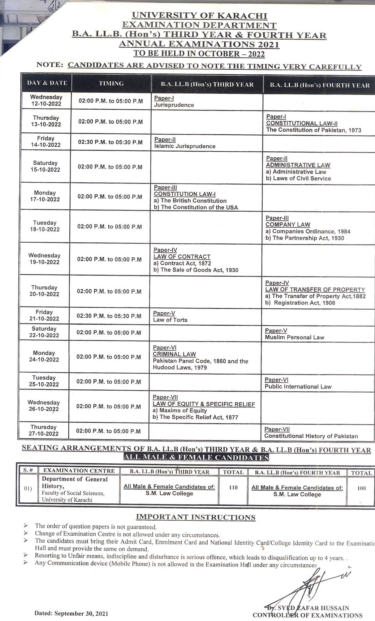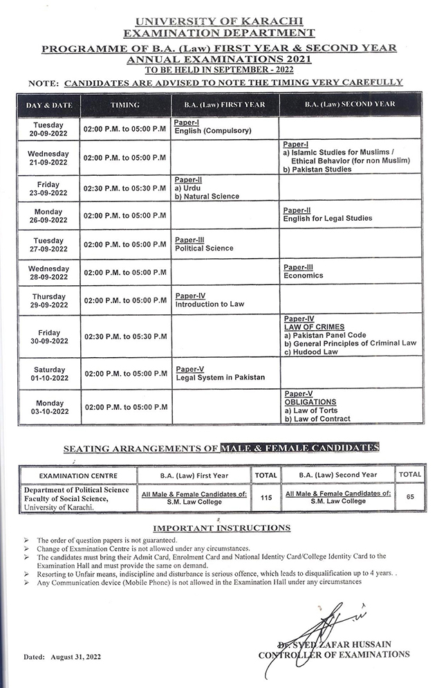 Revised Schedule of B.A (Law) Annual Examination 2021