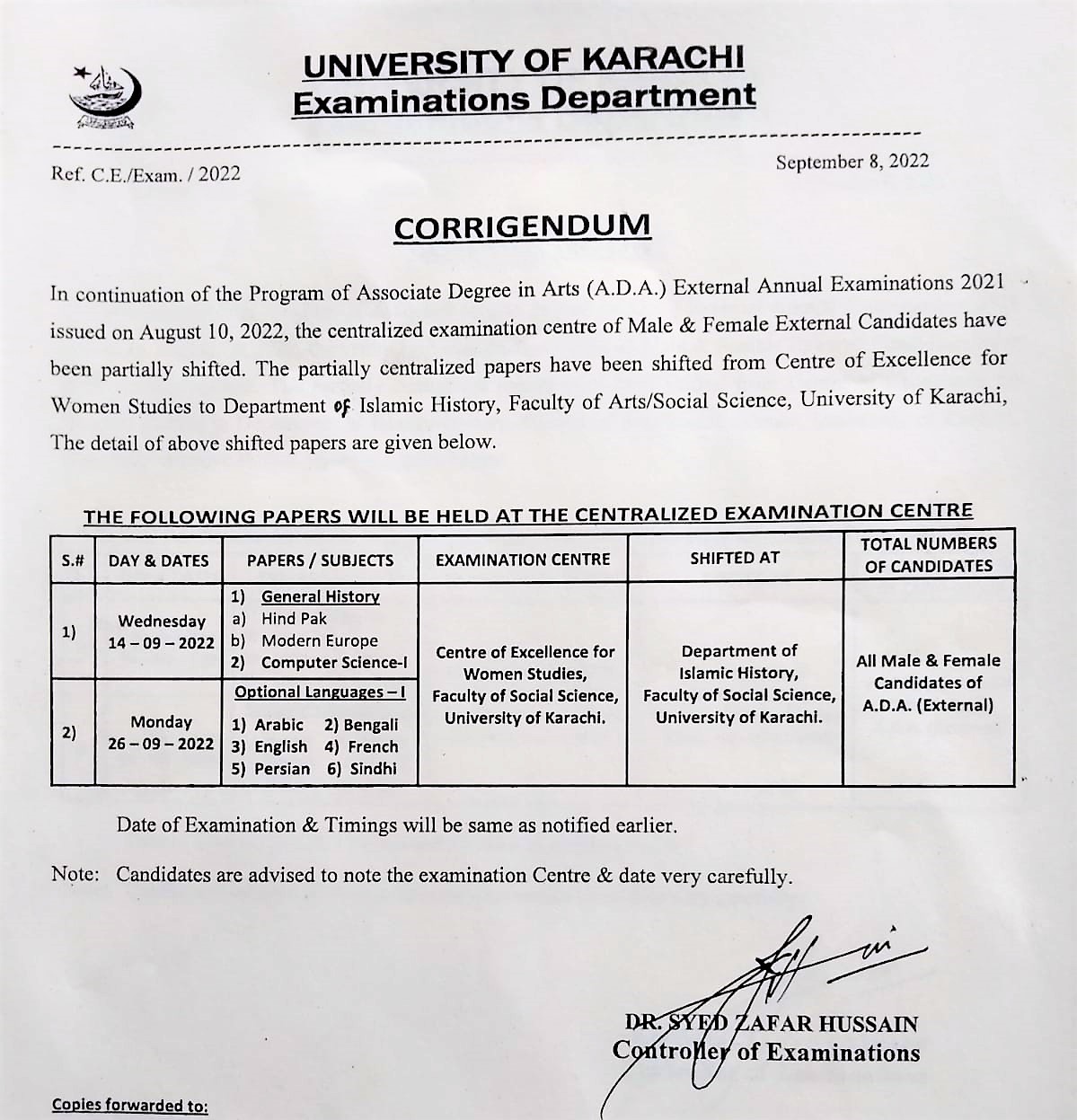 A.D.A Annual Examinations 2021 (Corrigendum)