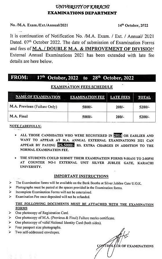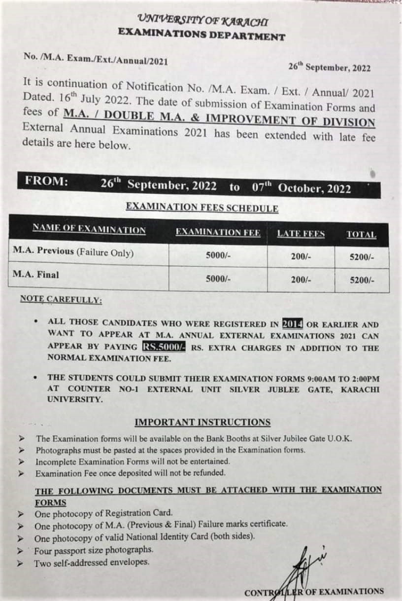 Fee Schedule of M.A / Double M.A (Ext) Annual Examination 2021