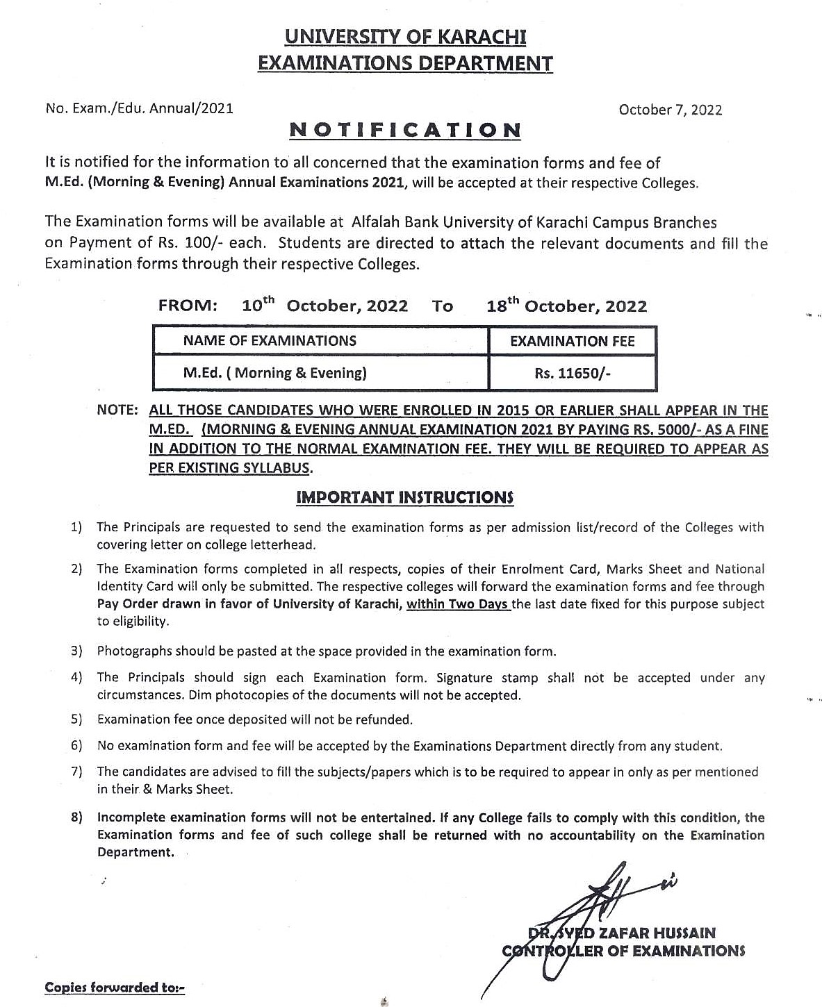 Fee Schedule for M.Ed (Morning & Evening) Annual Examinations 2021