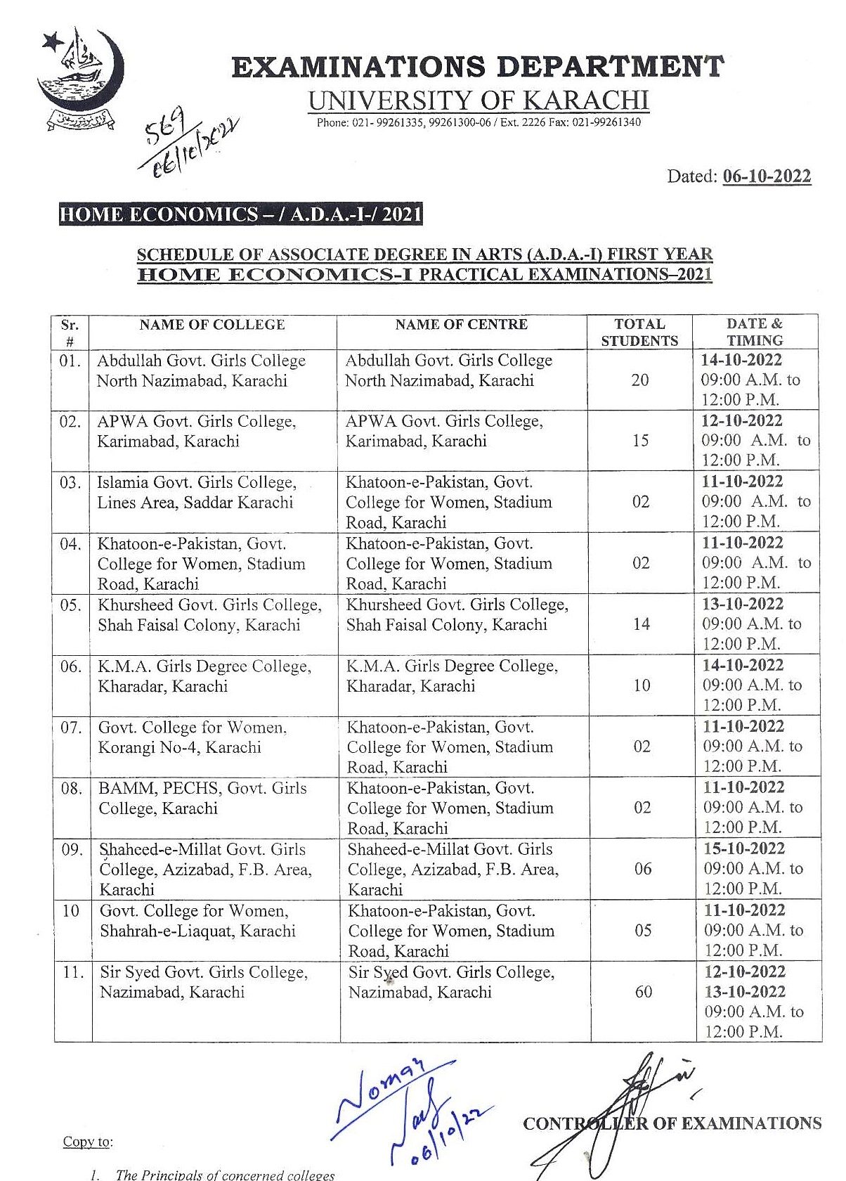 Schedule of A.D.A-I Home Economics-I Practical Examination 2021
