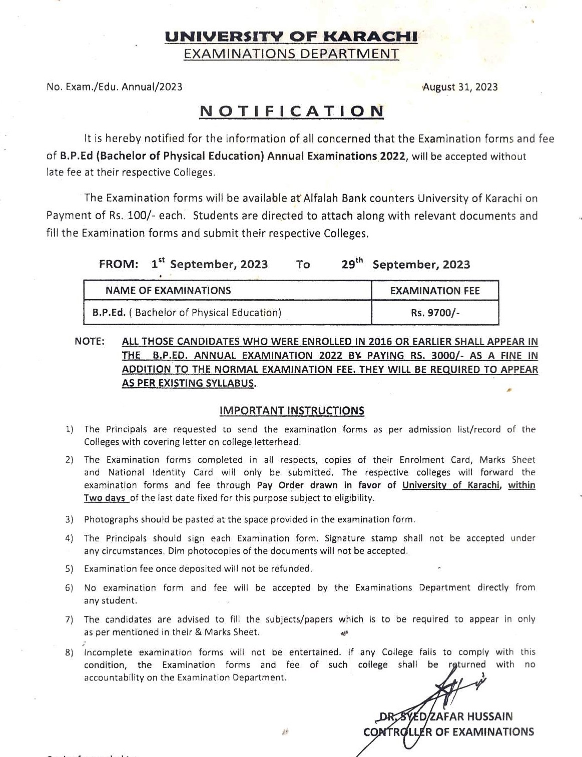 Fee Submission of B.P. Ed Annual Examinations 2022