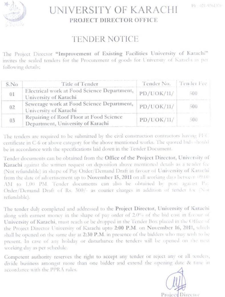 B.A. / B.Sc. / B.Com. Regular Annual Examination29 October 2011 Schedule of Examination forms and fee submission for Exam 2011 :: Read More Rescheduled paper of M.B.B.S. Third Professional Supplementary29 October 2011 M.B.B.S. Third Professional Supplementary Examination 2011 postponed paper has been rescheduled :: Read More D.L.O. Annual Examination25 October 2011 Schedule of submission of examination forms and fee :: Read More B.A. / B.Com. / B.O.L. and Improvement External25 October 2011 Registration form submission schedule for 2011 :: Read More UoK will remain closed on 24-Oct23 October 2011 The university will remain closed on Monday, 24-Oct-2011 to mourn the tragic demise of the great leader Begum Nusrat Bhutto. All examination scheduled for 24-Oct have been postponed. New dates will be announced later - P.R.O. Academic Council20 October 2011 A special session of Academic Council is convened at Arts Auditorium University of Karachi on Friday, 21st October 2011 at 10:00 a.m. The session will discuss and finalize the Admissions for the academic year 2012 :: Read More M.B.B.S. First Professional (Part A & B) Annual Examination 201219 October 2011 Date for submission of Examination forms announced :: Read More L.L.M. Final Annual Examination 201119 October 2011 Date for submission of thesis extended :: Read More Tender Notice18 October 2011 Repair and maintenance work at Department of Food, Science and Technology :: Read More B.A. / B.Sc. / B.Com. Regular Annual Examination18 October 2011 Schedule of Examination forms and fee submission for Exam 2011 :: Read More B.A. / B.Com. / B.O.L. and Improvement External15 October 2011 Registration form submission schedule for 2011 :: Read More B.A. / B.Com. / B.O.L. External Annual Examination 201115 October 2011 Examination forms and fee submission schedule :: Read More University will remain open on Saturday as usual14 October 2011 It was announced that the University will remain open on Saturdays. All academic and administrative work will take place as usual. The Academic Council will decide about two weekly holidays at the end of the current semester. Establishment of Computer Lab for Blind Students14 October 2011 A computer lab for visually impaired students of the University of Karachi is being established in the Department of Library and Information Science. The lab is well equipped with latest special softwares for blind i.e. Jaws 2 and Open Book as well as the audio equipment to make it accessible for these students. All blind students of the University are now using this lab on their own convenient timing. Guidance and Training is also being provided by the Department. Revised schedule for second semester 201113 October 2011 Revised schedule for teaching and examinations for second semester 2011 (Morning Programme) has been announced :: Read More Series of lecture at KIBGE13 October 2011 A lecture on "Effective use of Turnitin and End Note for a researcher" has been arranged :: Read More B.D.S. First Professional Annual Examination 201112 October 2011 Examination forms and fee of candidates of Private Medical Colleges will be accepted as per provided schedule :: Read More M.B.B.S. Third Professional Supplementary 201112 October 2011 Programme of M.B.B.S. Third Professional Supplementary Examination 2011 has been announced :: Read More D.T.C.D. Annual Examination 20118 October 2011 Programme of D.T.C.D. Annual Examination 2011 has been announced :: Read More D.C.H. Annual Examination 20118 October 2011 Revised programme of D.C.H. Annual Examination 2011 has been announced :: Read More M.Sc. (Home Economics) Annual Examination 20117 October 2011 Examination forms and fee for failure candidates will be accepted as per provided schedule :: Read More Mitsubishi Corporation International Scholarship 20117 October 2011 Application forms for the scholarship available :: Read More B.A. / B.Com. / B.O.L. and Improvement External6 October 2011 Registration form submission schedule for 2011 :: Read More B.A. / B.Com. / B.O.L. External Annual Examination 20116 October 2011 Examination forms and fee submission schedule :: Read More Syeda Mubarik Begum Scholarship for female students5 October 2011 Application forms for the scholarship available :: Read More Department of Visual Studies Admissions 20124 October 2011 Admissions 2012 for B. Arch, B. Design and B.F.A. at Department of Visual Studies will begin from October 10, 2011 :: Read More |