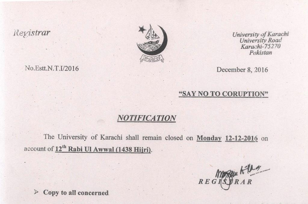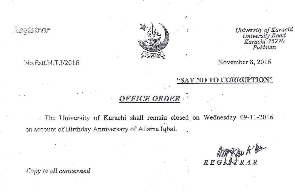 University of Karachi has organized a seminar on "Role of Youth in Fight against Corruption" in collaboration with National Accountability Bureau (NAB) on today Friday 18th November 2016 at 11:00 am at Arts Auditorium KU. A presentation will be presented by NAB while the acting Vice Chancellor KU Prof. Dr. Khalid Iraqi will also address on the occasion.