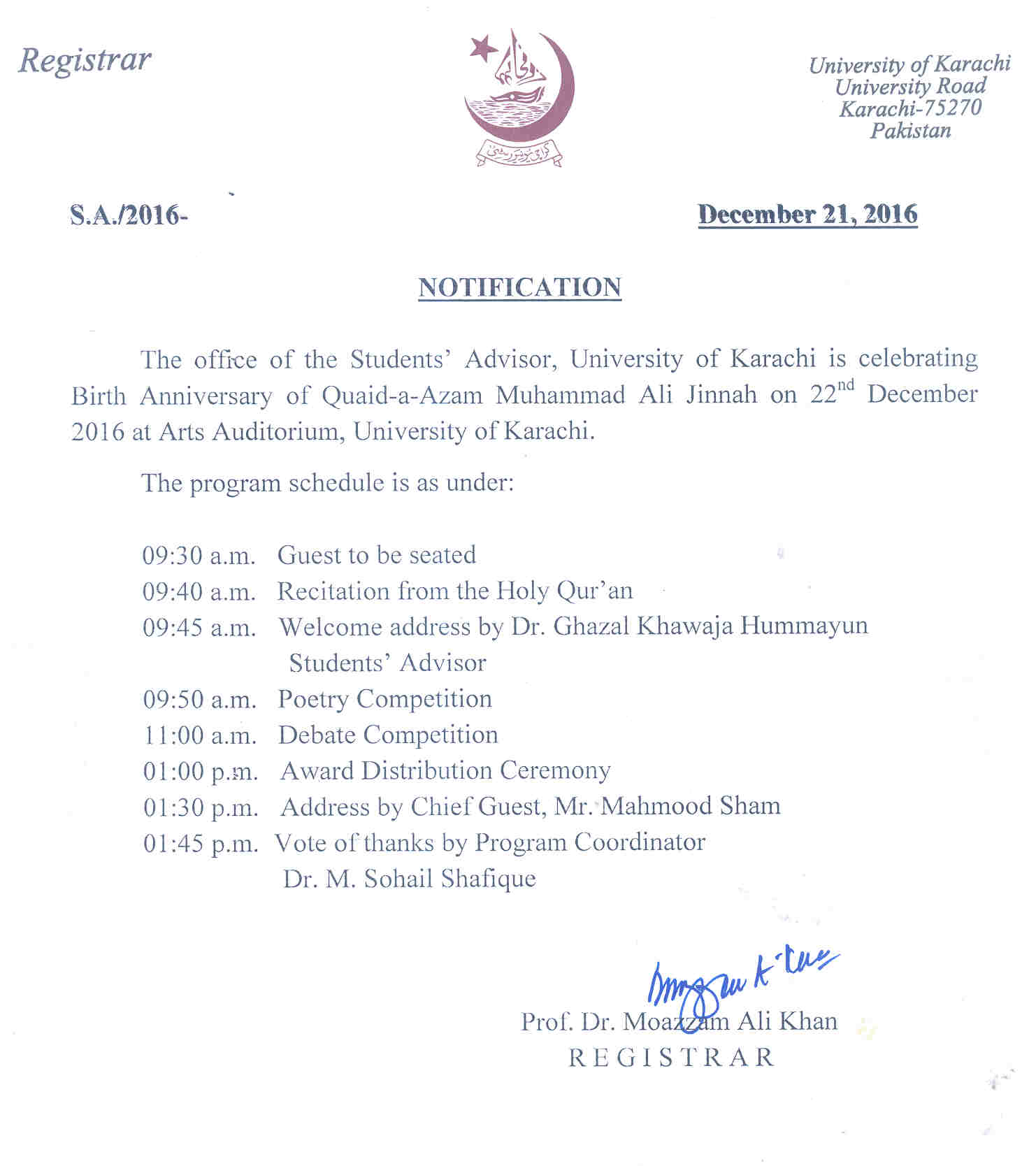 The office of the Students' Advisor, University of Karachi is celebrating Birth Anniversary of Quaid-a-Azam Muhammad Ali Jinnah on 22nd December 2016 at Arts Auditorium, University of Karachi.