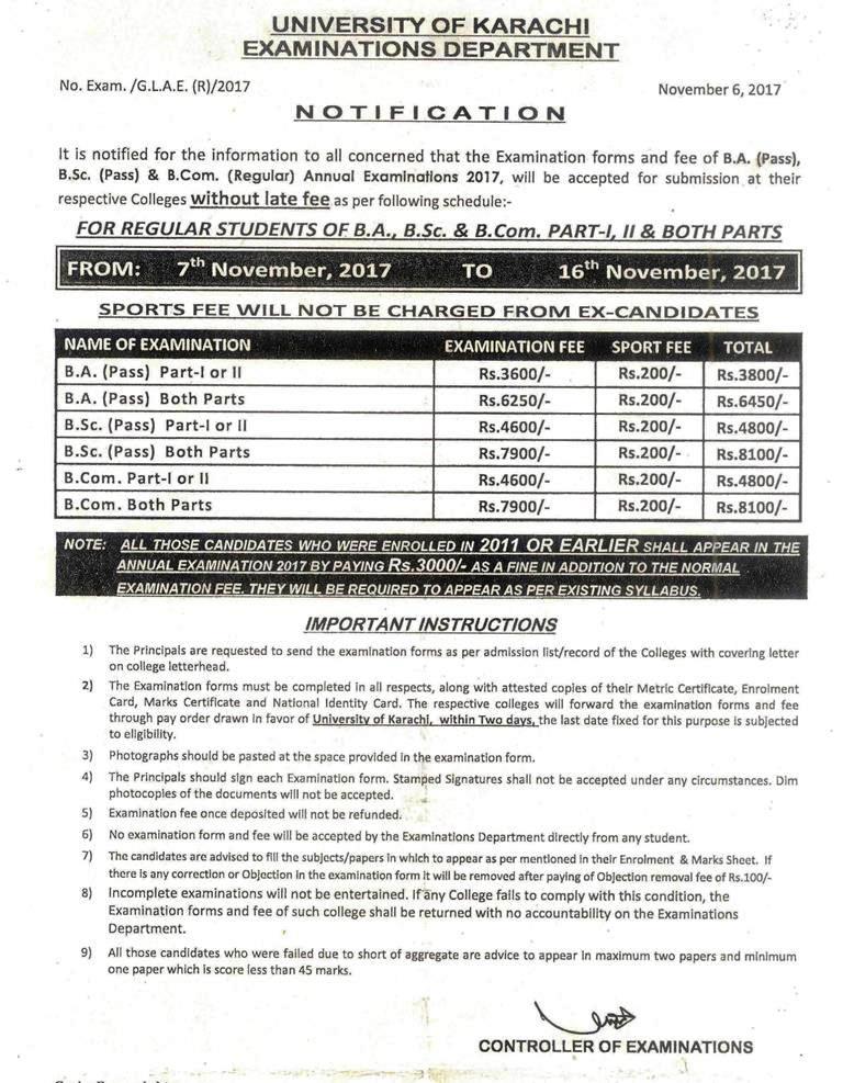 Exam Fee Schedule of BA (P) , B.Sc (P) & B.Com (Regular) Annual Examinations 2017