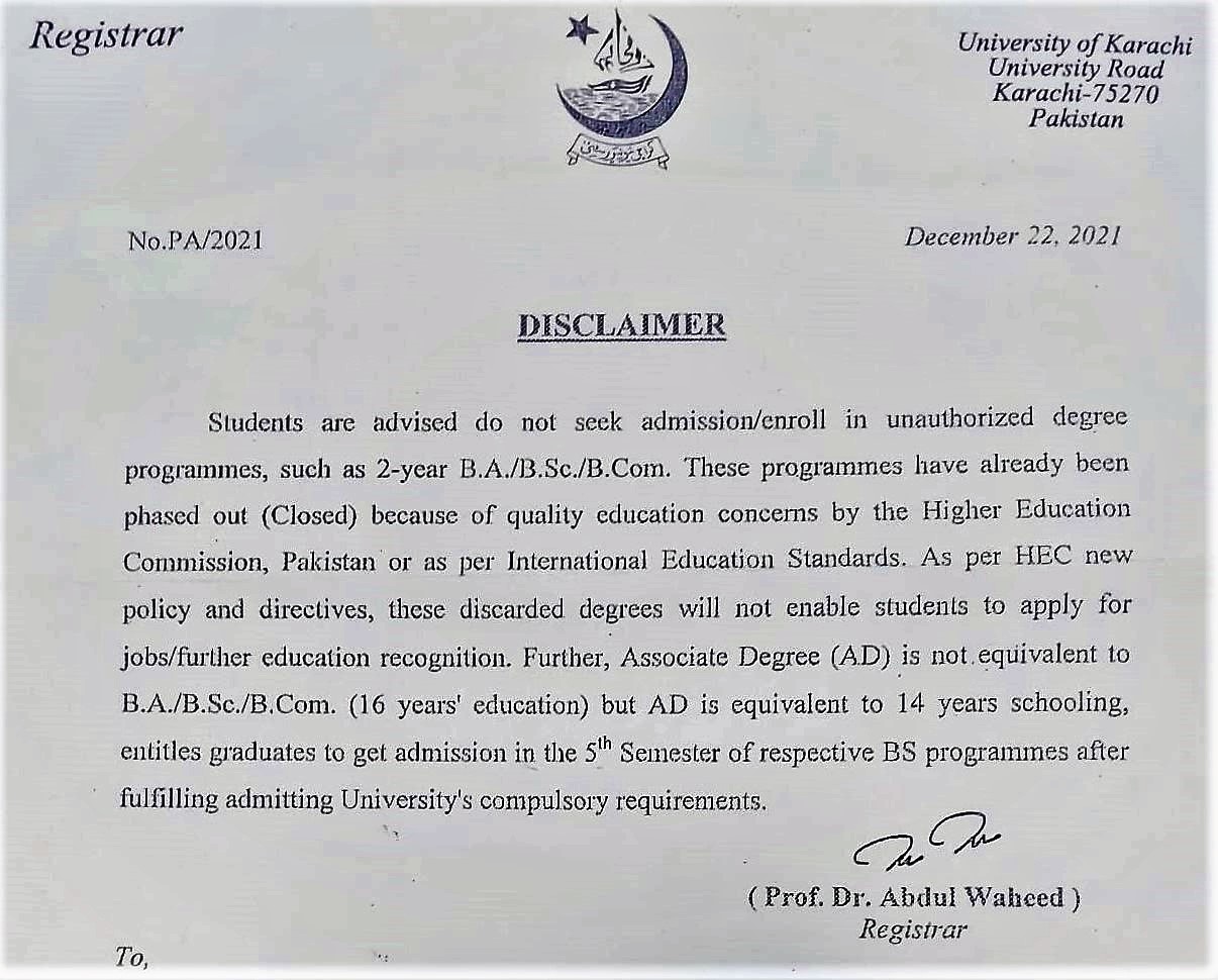 Do Not Seek Admission/Enroll in Two(2) Year Unauthorized Degree Program (Disclaimer)
