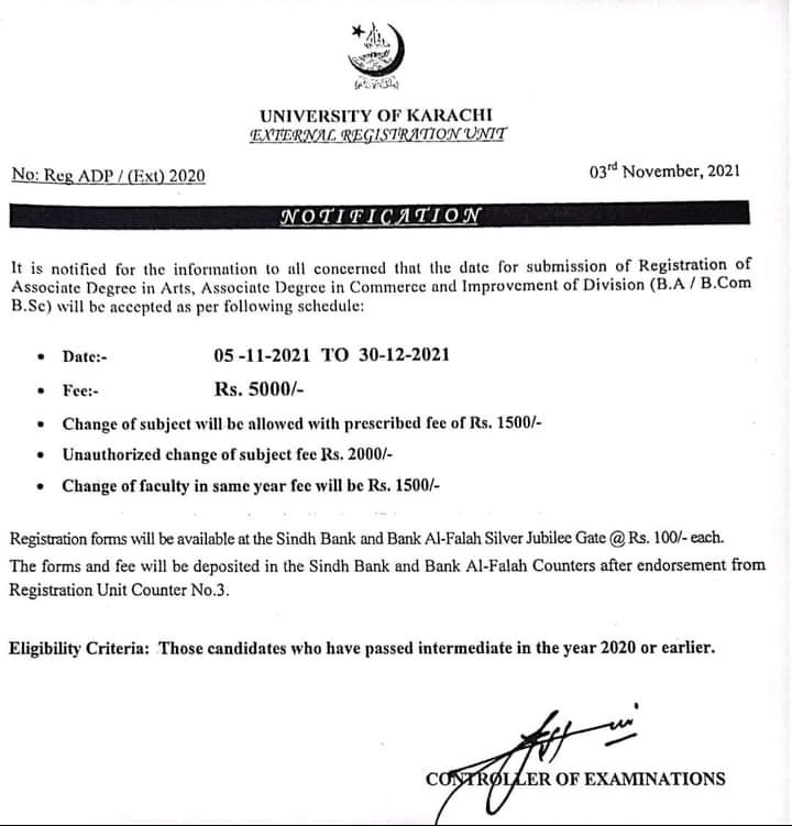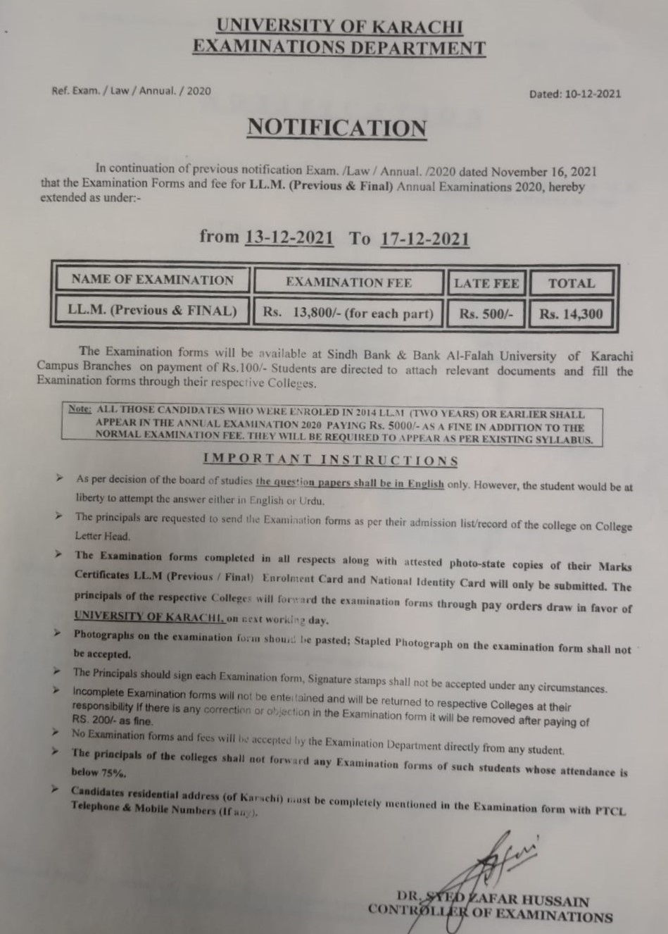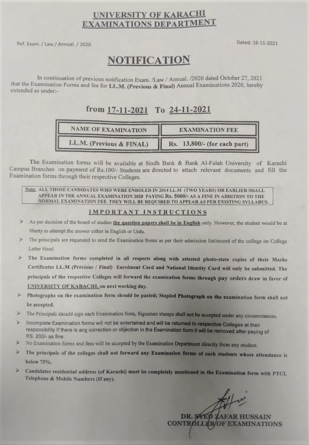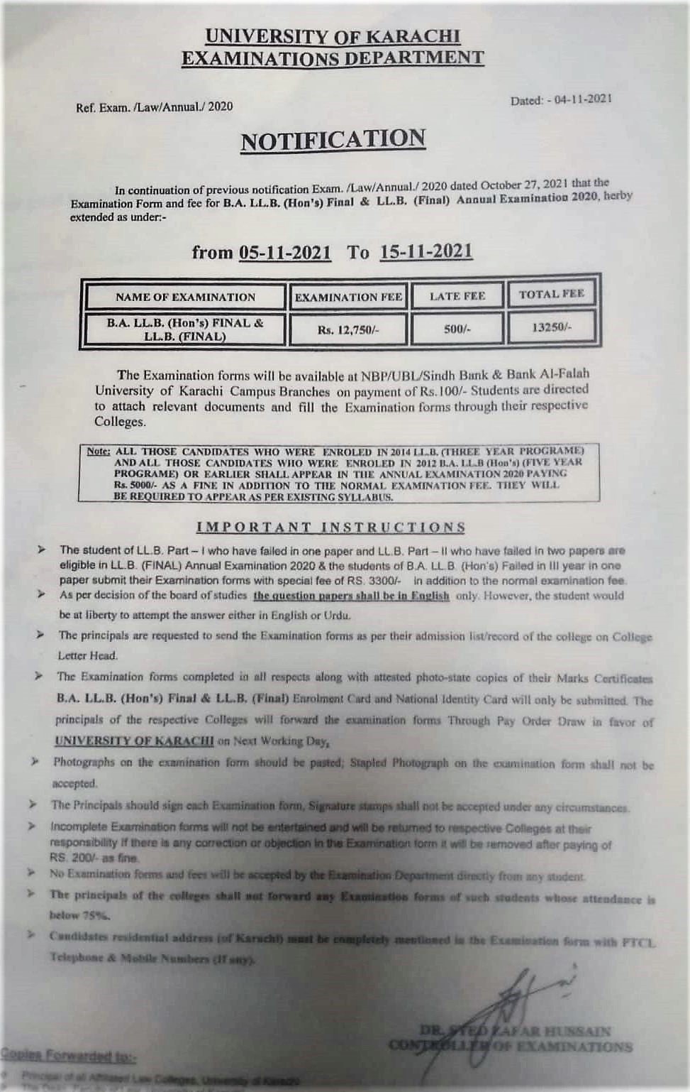 Date Extended Fee Schedule of B.A. LL.B (Hons) Final & LL.B (Final) Annual Examination 2020