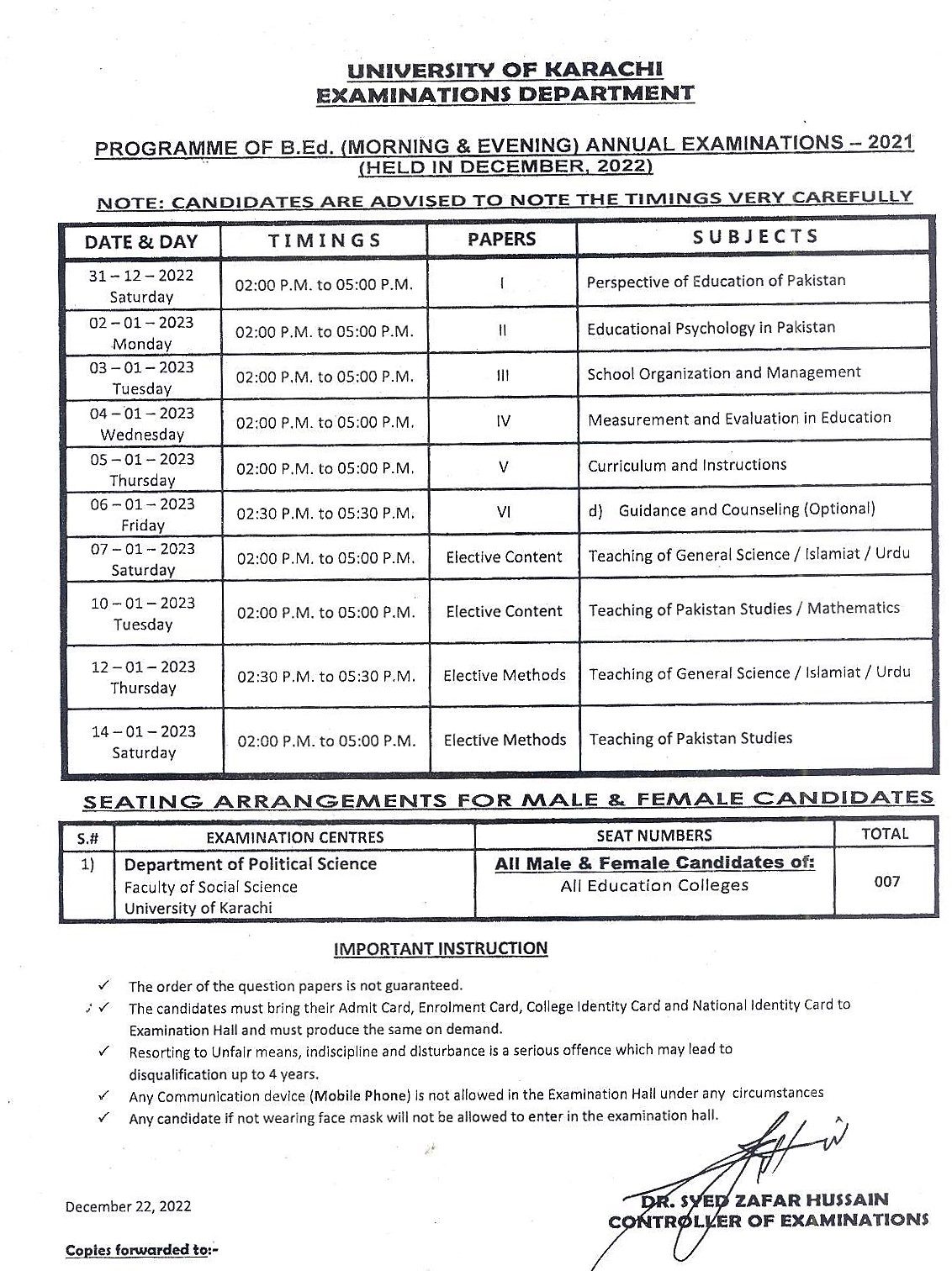 Revised Schedule of Postponed Papers (Iqbal Day)
