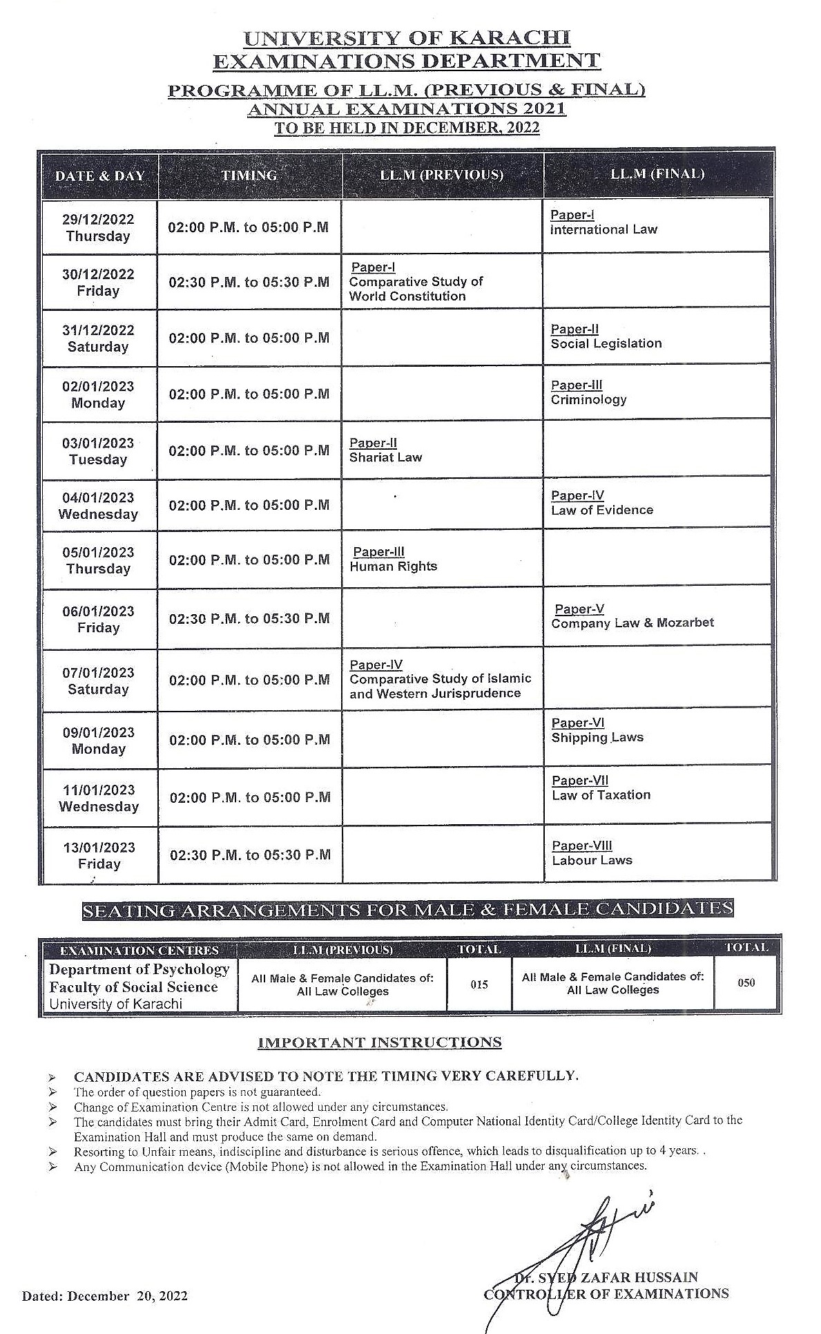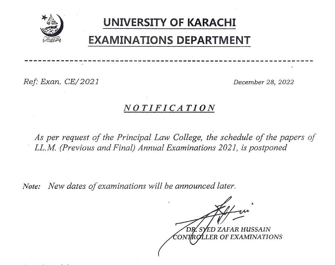 Postponed LL.M (Previous & Final) Annual Examination 2021