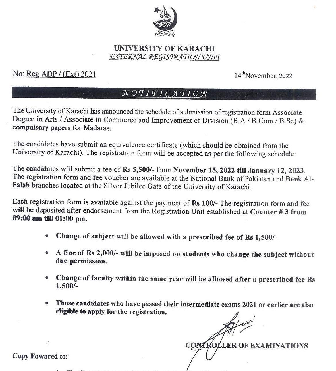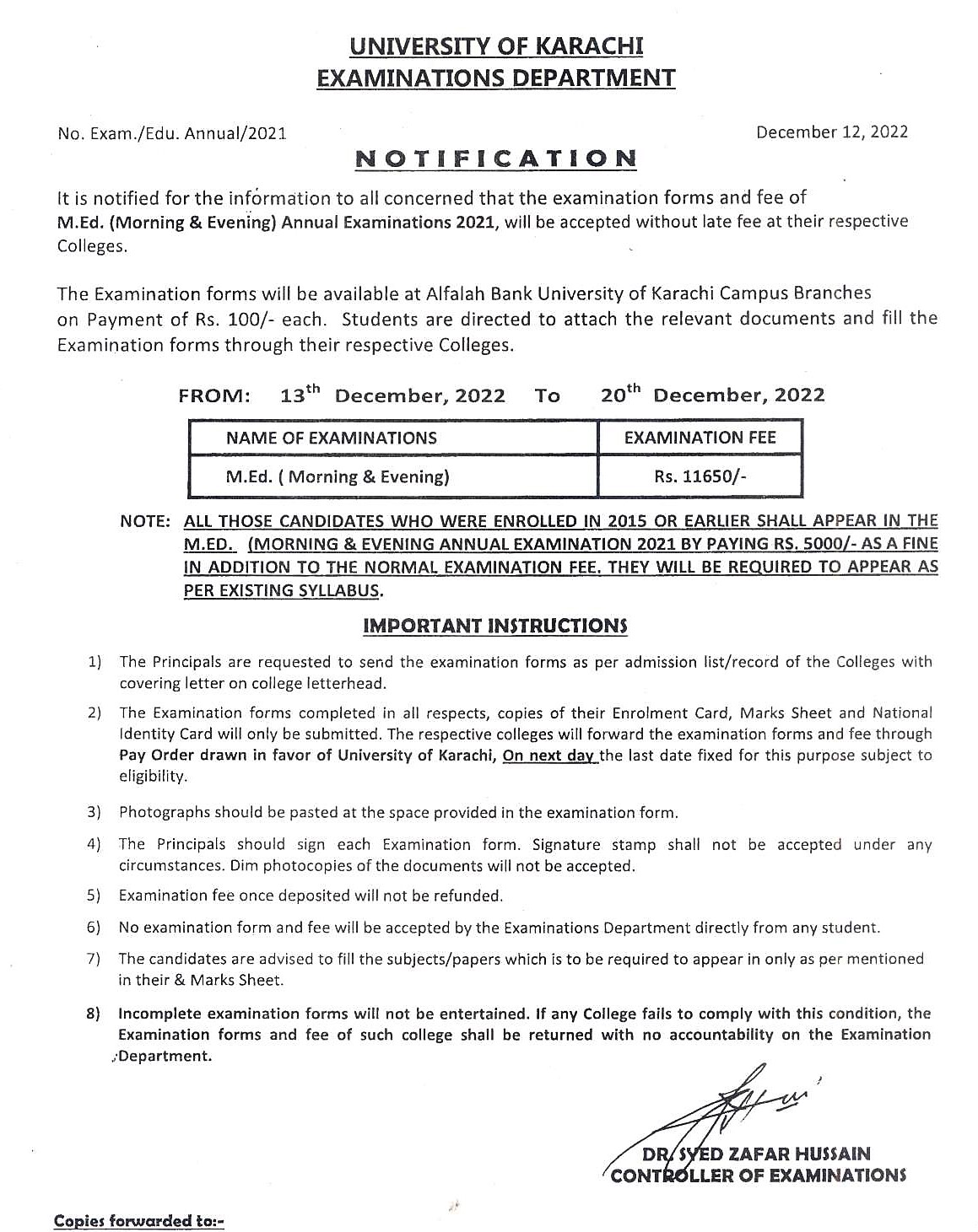 M.Ed Fee Schedule for Annual Examination 2021