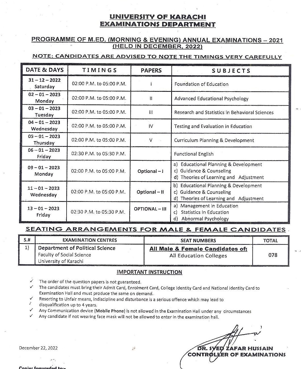 Programme of M.Ed (Morning & Evening) Annual Examination 2021