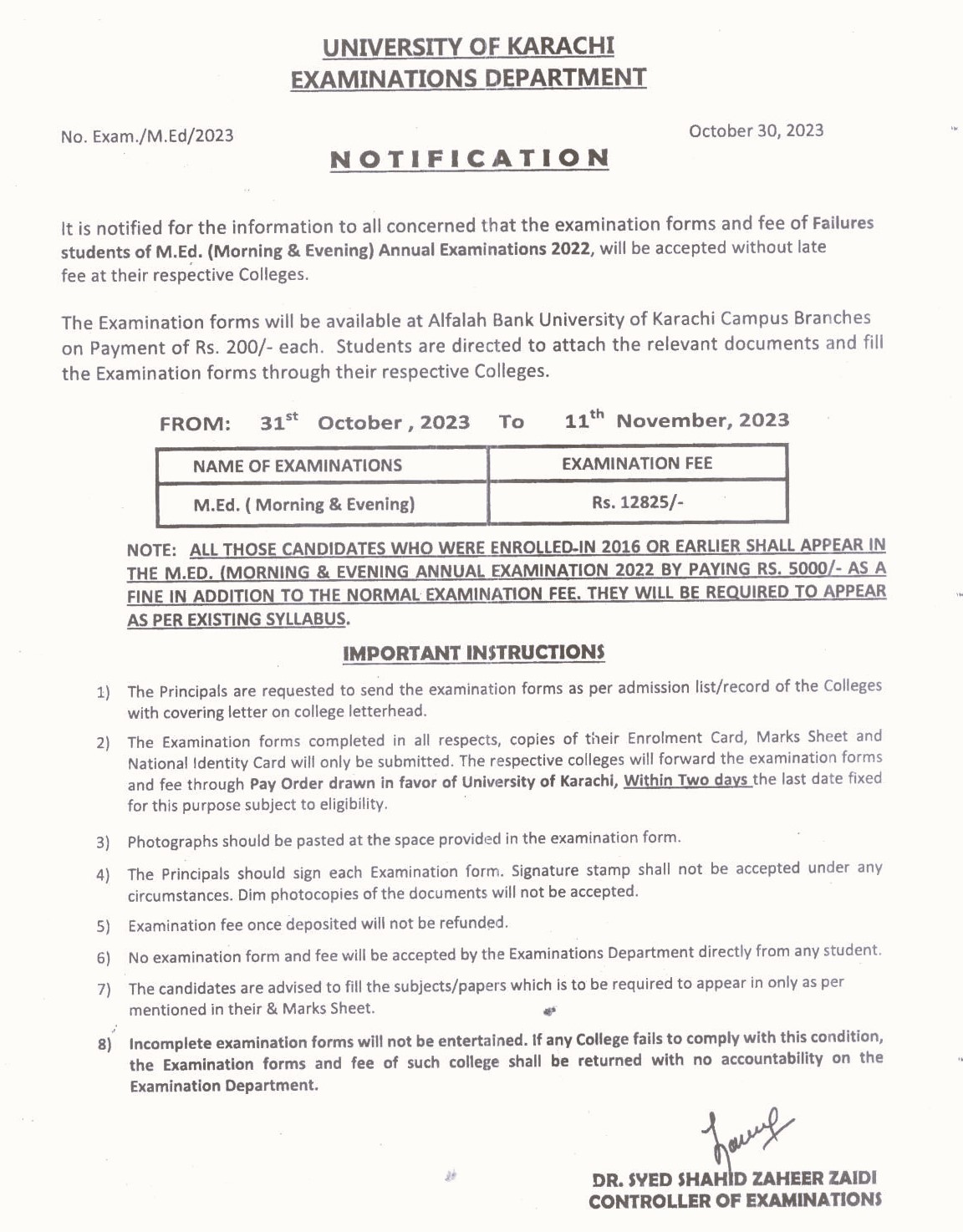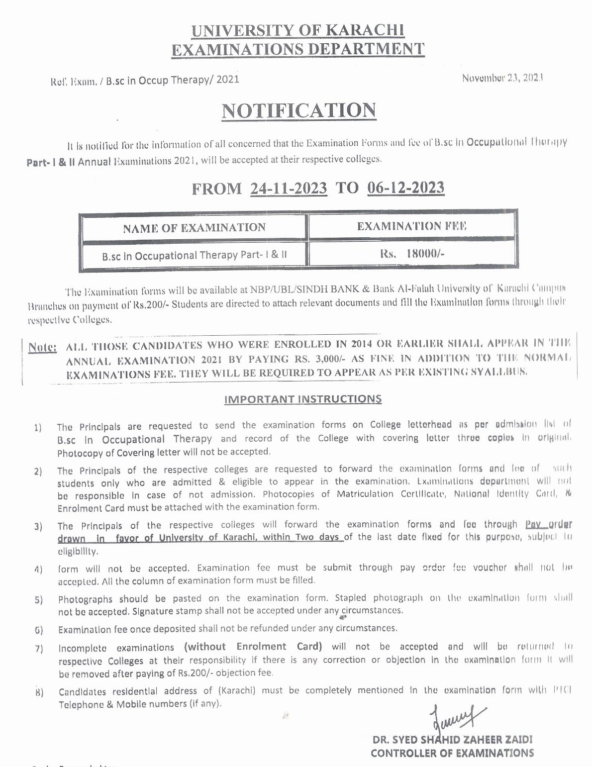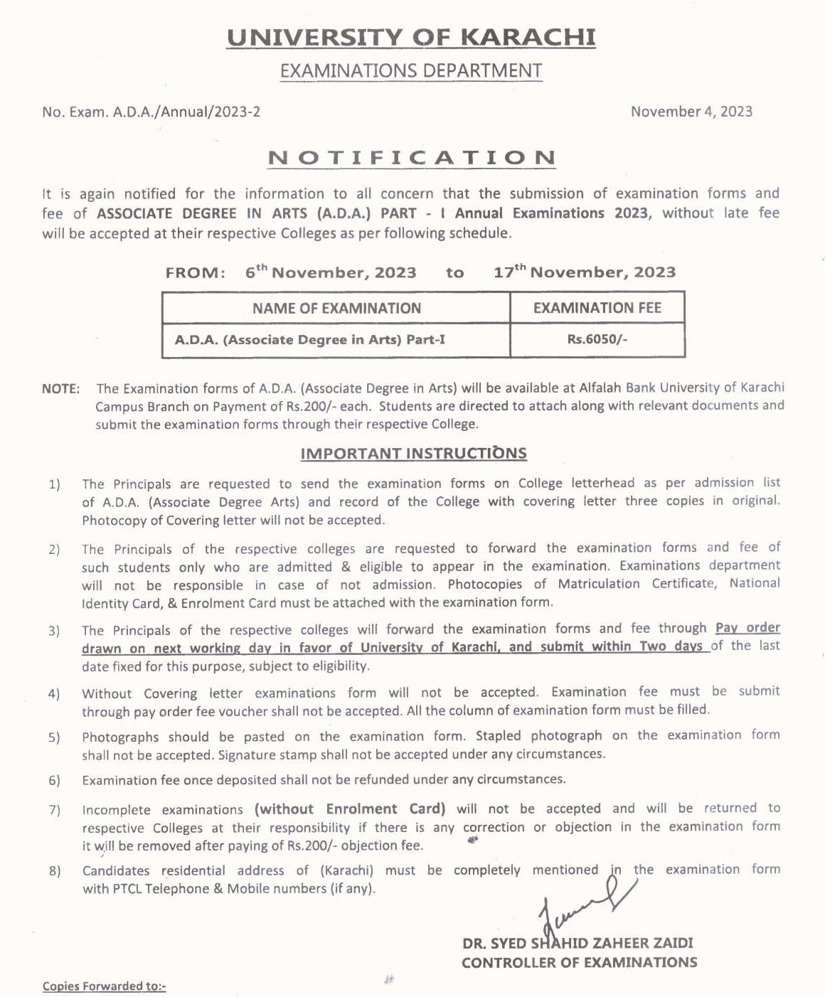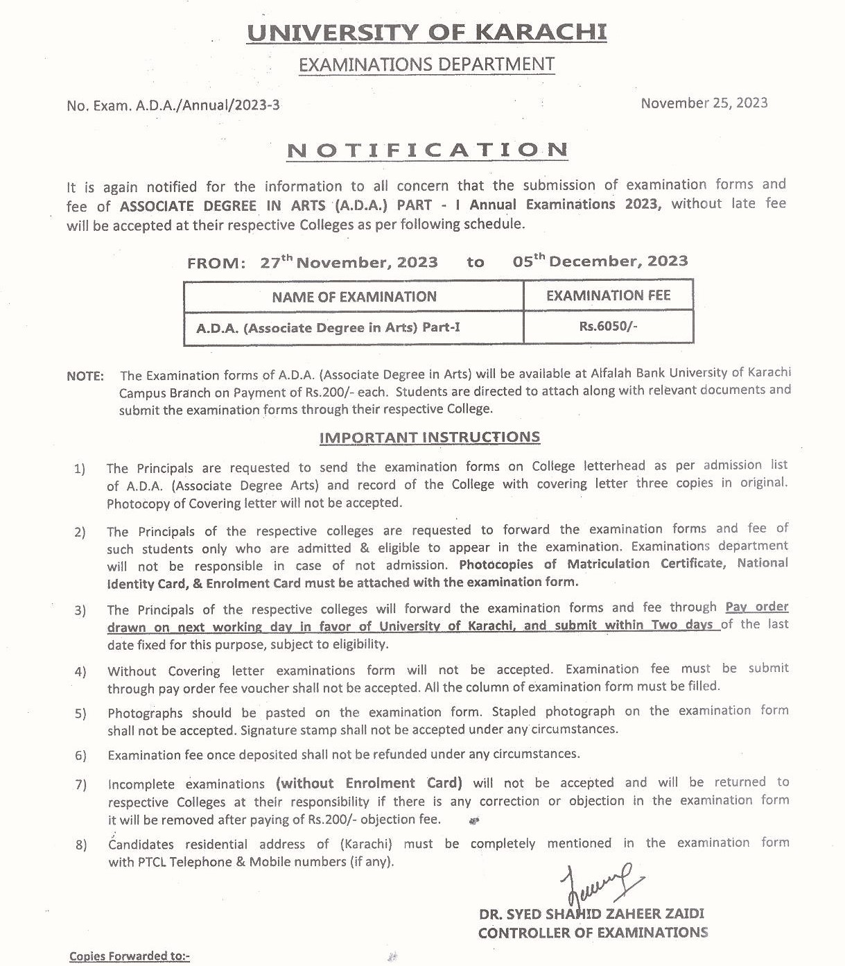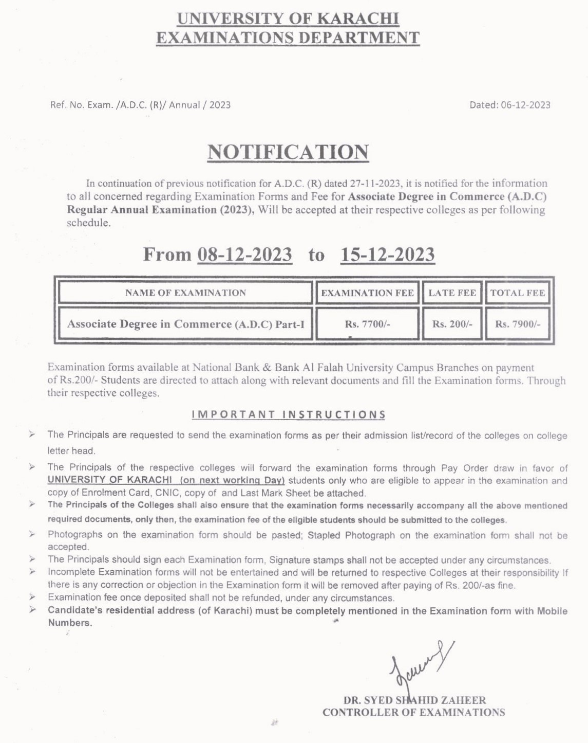 Fee Schedule of A.D.C (Regular) Annual Examination 2023