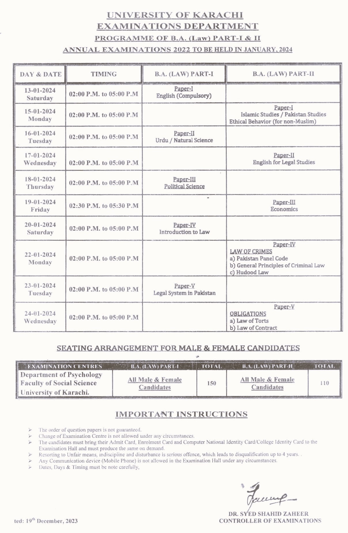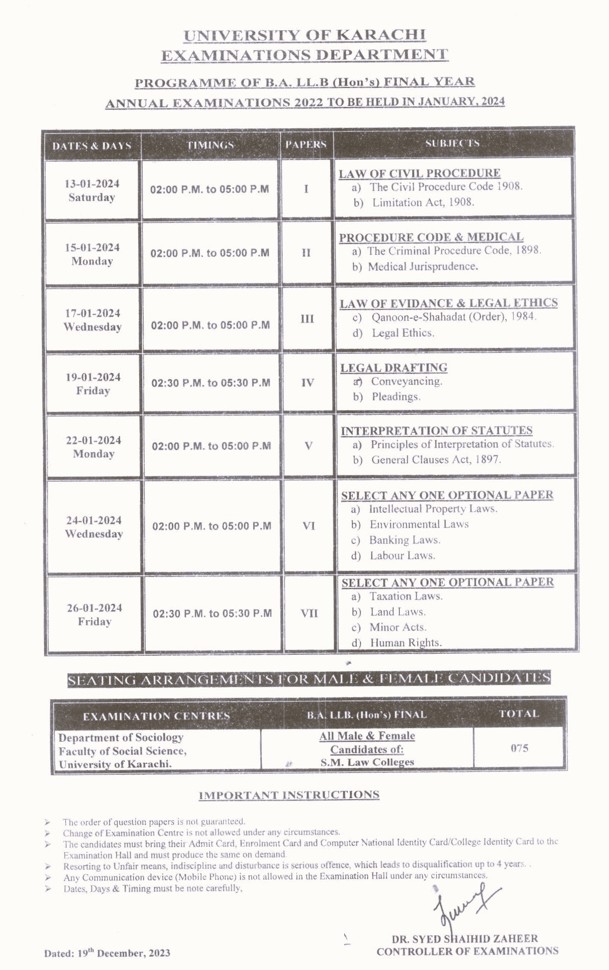Program of B.A L.L.B (Hon's) Final Year Annual Examination 2022
