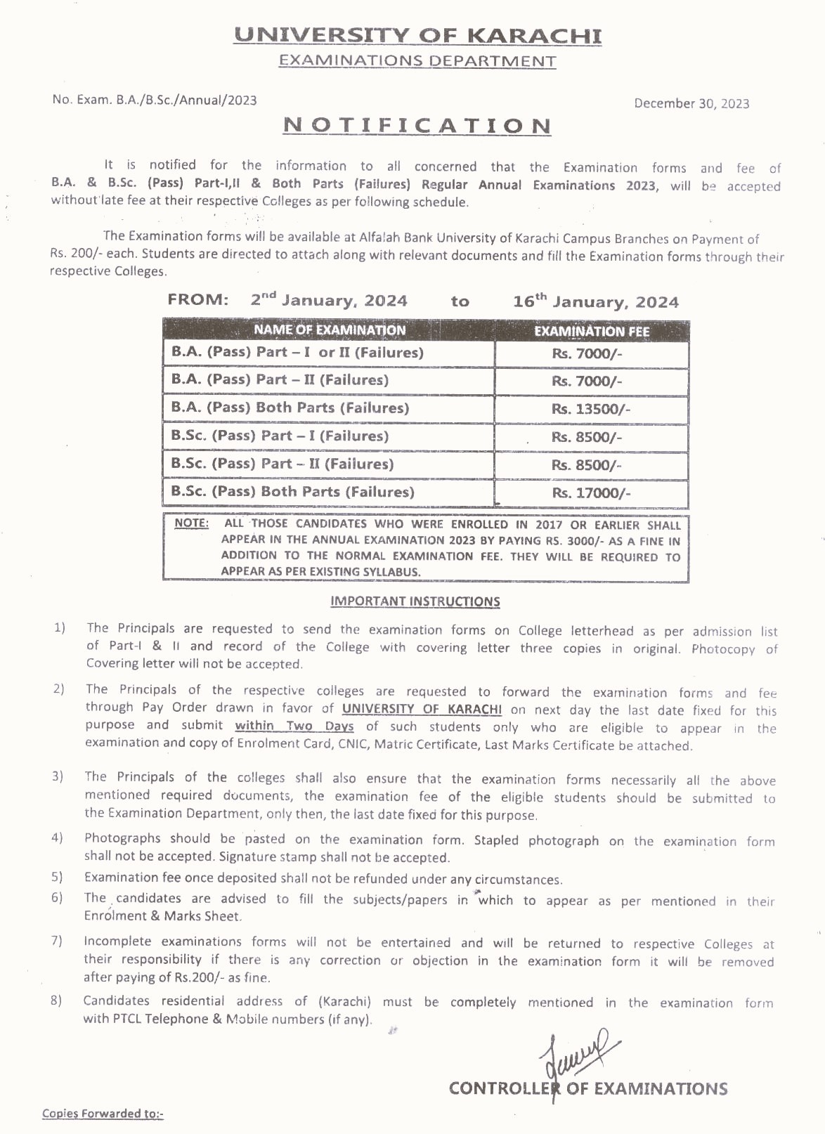Submission Fee for B.A & B.Sc (Failures) Regular Annual Examination 2023