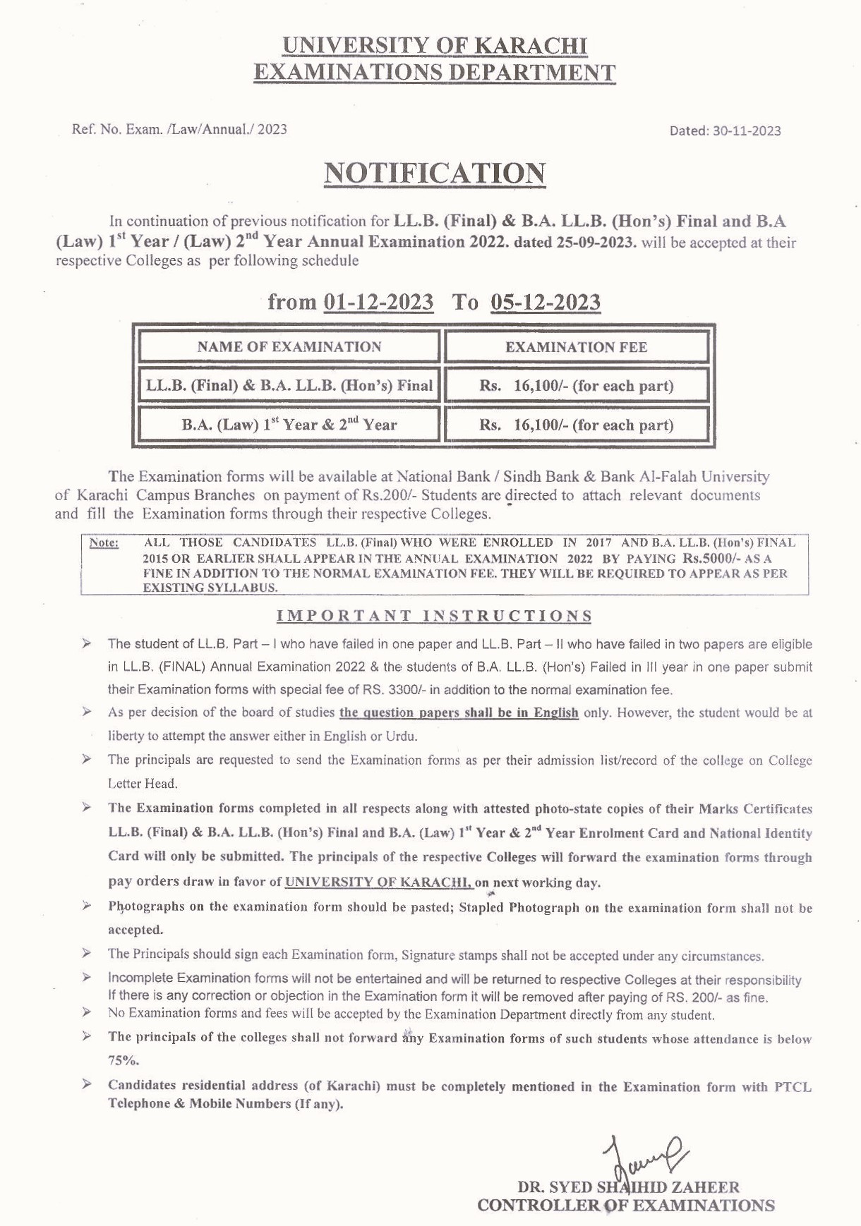 Fee Schedule fot LLB (Final), BA LLB (Hons's) Final & BA (Law) Annual Examination 2023