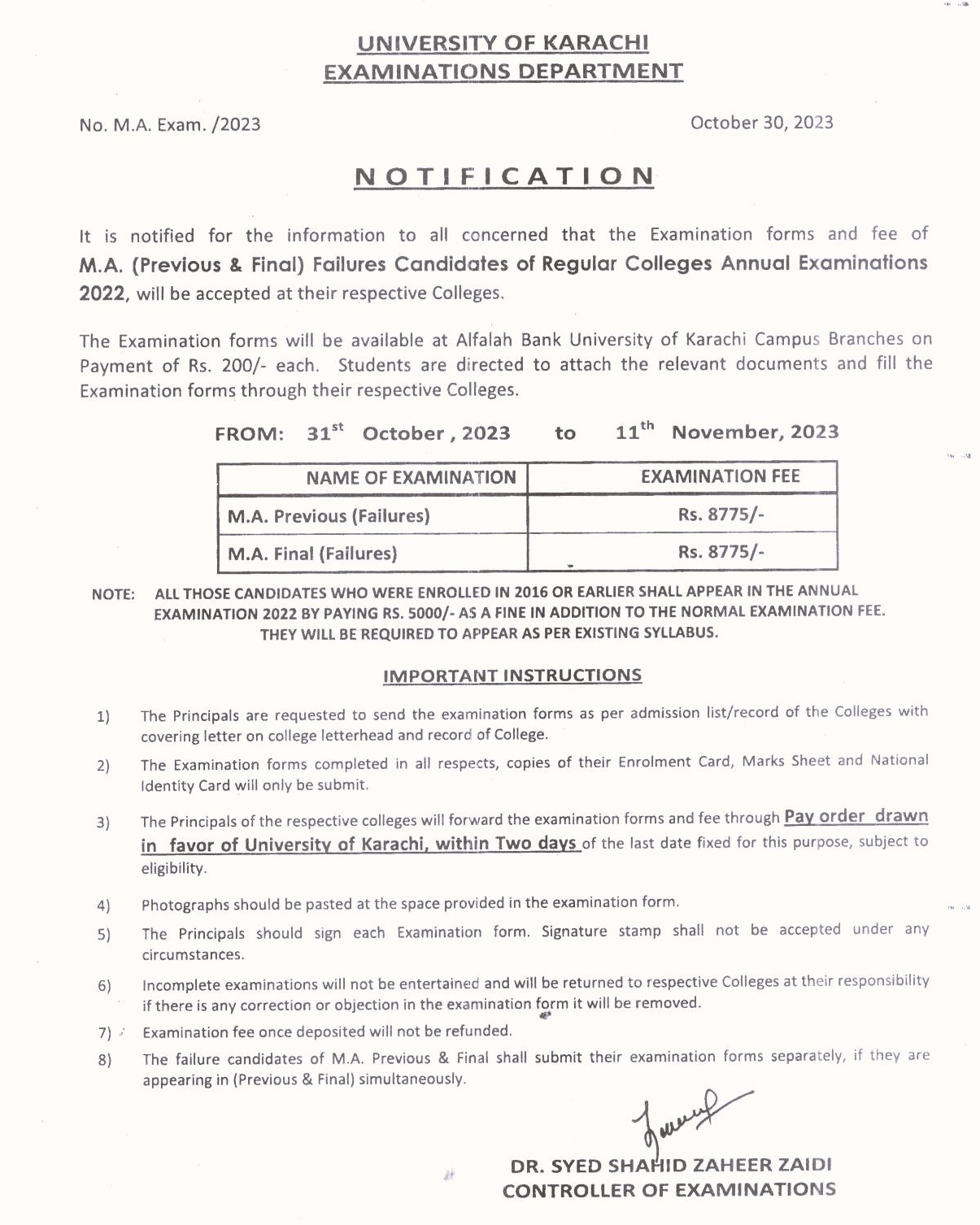 Examination Fee of M.A Regular (Previous & Final) Annual Examinations 2022